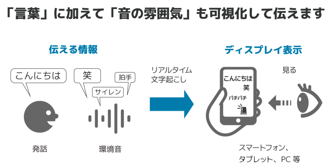 ・YY文字起こし:会話をリアルタイムで文字化し、環境音もイラストや文字で表示します。