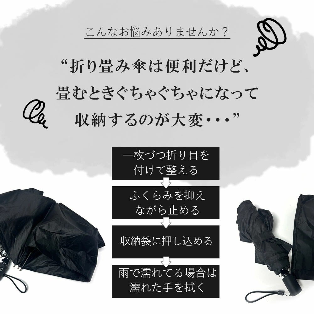 日本人の大半の方が持つ折りたたみ傘ですが、従来の折りたたみ傘では、「たたみにくい」「きれいにたためない」「何度も開け閉めするのが面倒」との不満の声も多く上がっております。