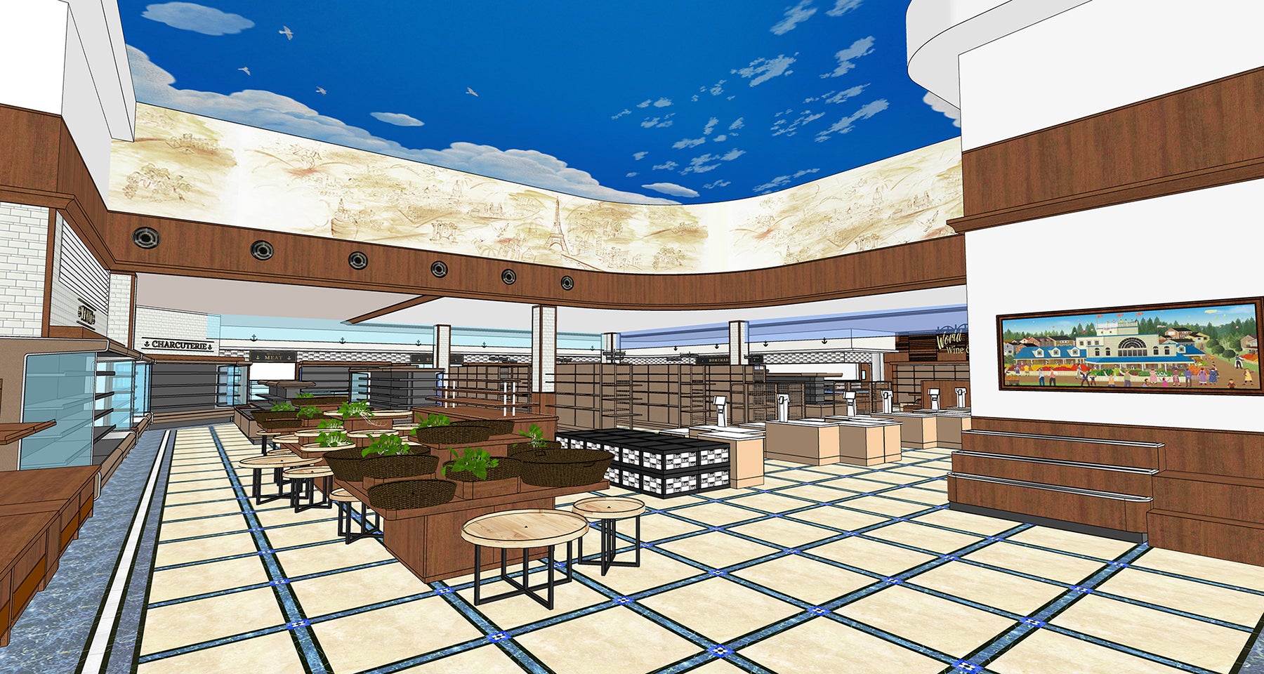 より描かれた壁画と、カラフルな色合いの床タイルで高級感溢れる欧州の街並みをイメー