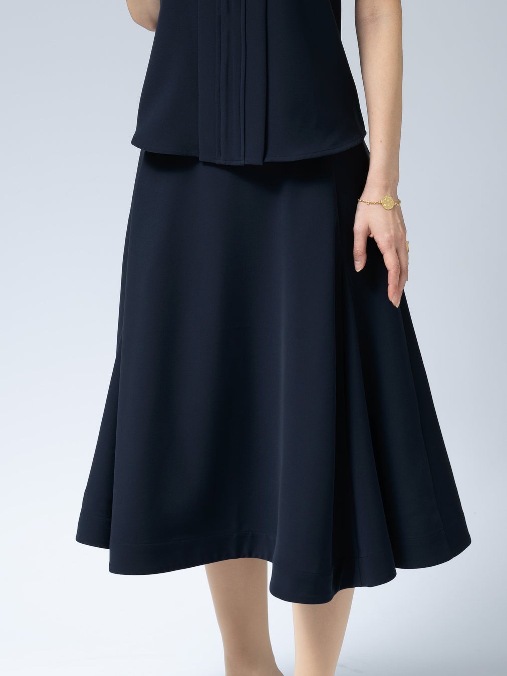 あえて均整を崩したプリーツのデザインが、フレアスカートならではの甘さや重さを軽減、洗練されたシルエットを演出。