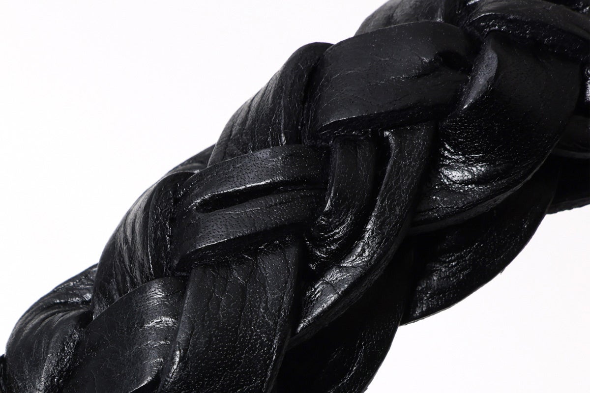 カウレザー ウェスタンメッシュベルト「asolina W07」は、編み込まれたレザーの量感と彫刻を施したバックルが特徴です。装飾的な要素を持ちながらも、どこか一箇所だけが前に出るのではなく、全体として佇まいが成立するよう設計されています。日常の装いにも自然に取り入れられる存在感を備えた一本です。