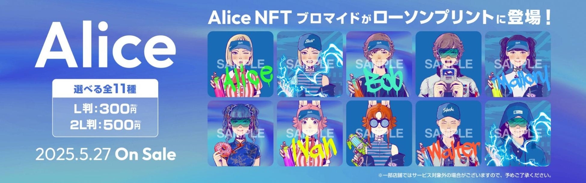 SLASH VISION PTE. LTD.(シンガポール、代表取締役社長:佐藤 伸介、以下「当社」)は、「LAWSON PRINT」サービスにて、Alice NFTとのコラボブロマイド全11種類の販売を2025年5月27日(火)より全国のローソン店内マルチコピー機にて開始することをお知らせいたします。