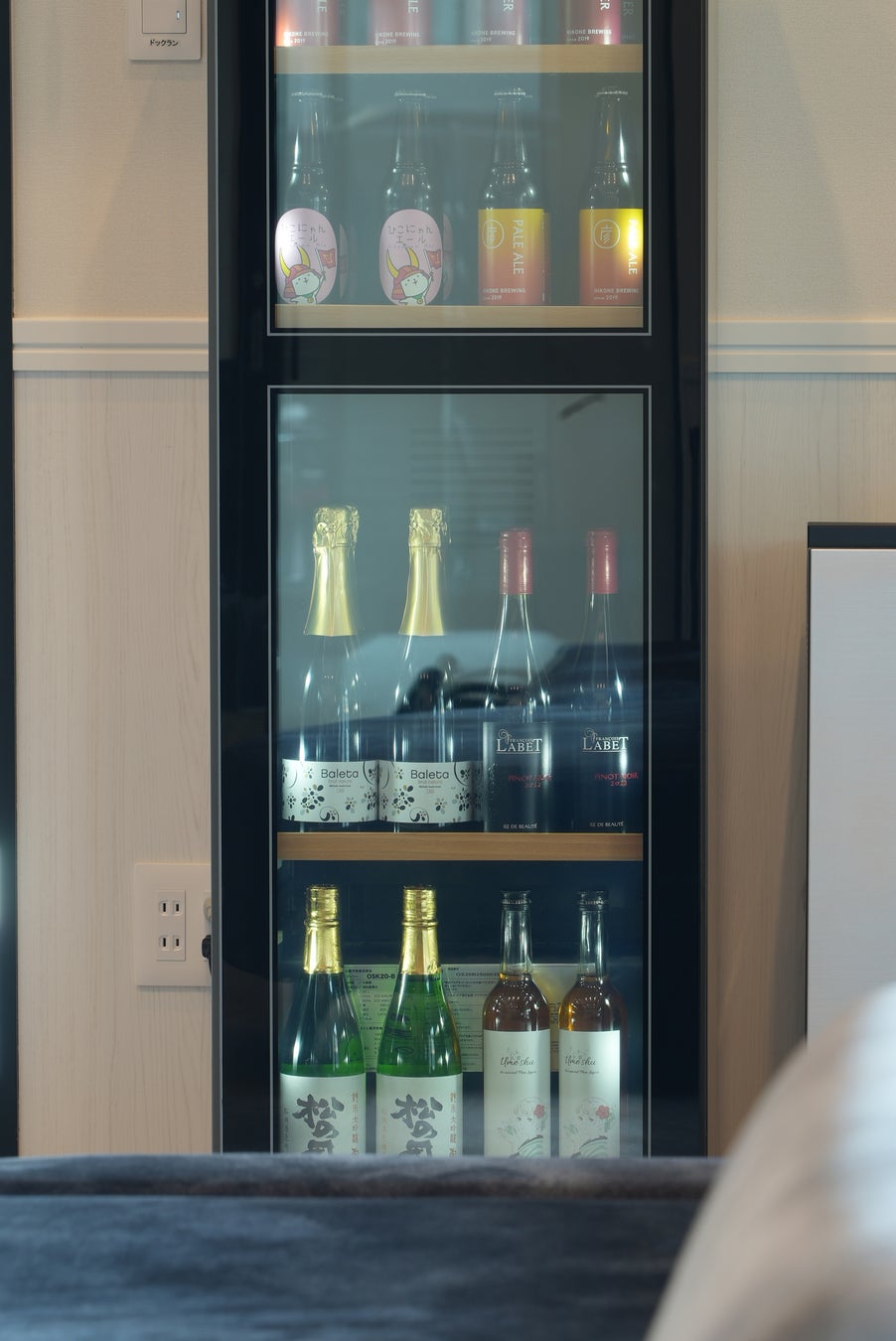 リビングには、スタッフ厳選の地酒やお食事に合わせやすいセレクトドリンクをワインセラーにラインナップ。