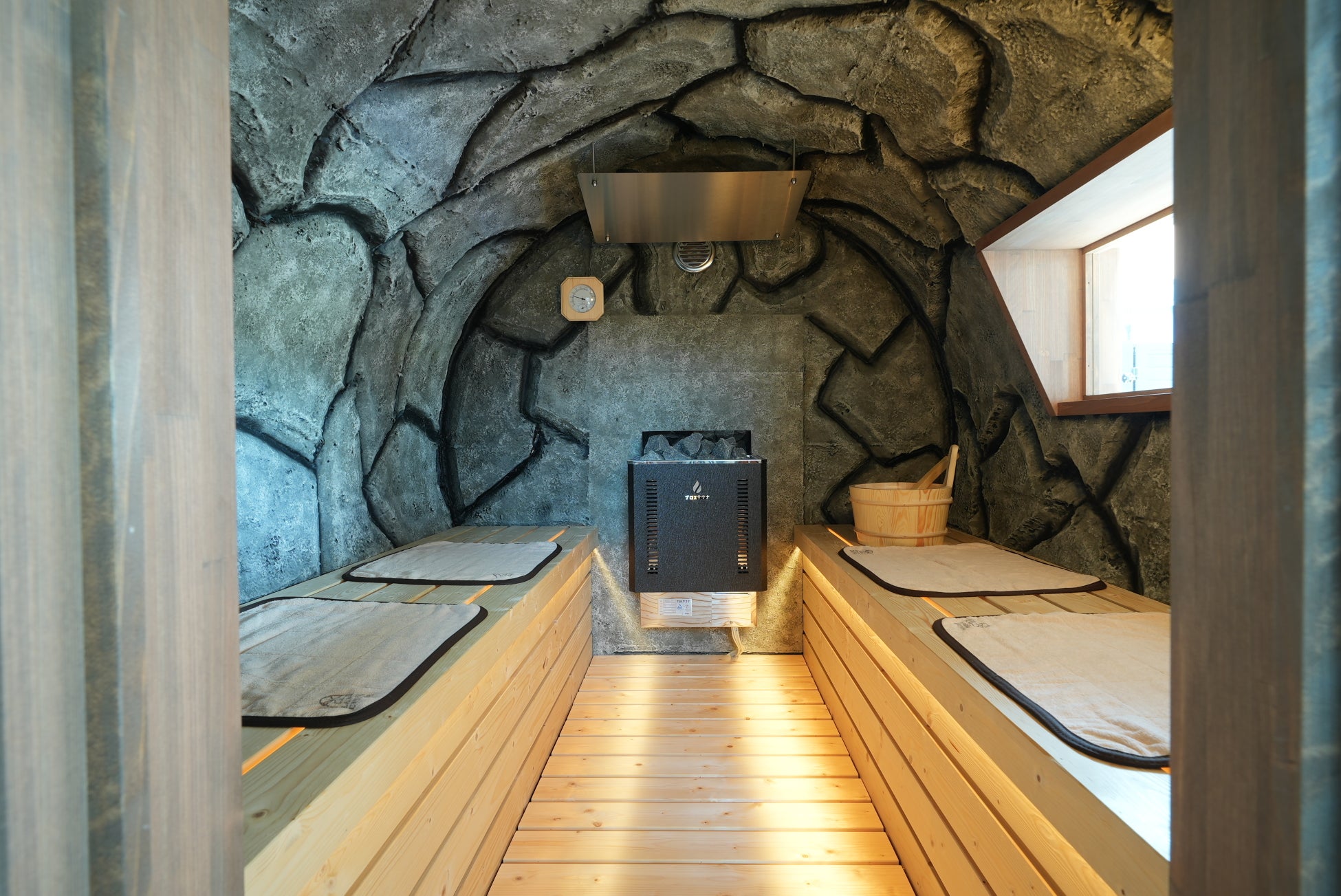 内部は洞窟をイメージした独創的なデザインとなっており、木製サウナとは一味違う、非日常の空間に没入いただけます。