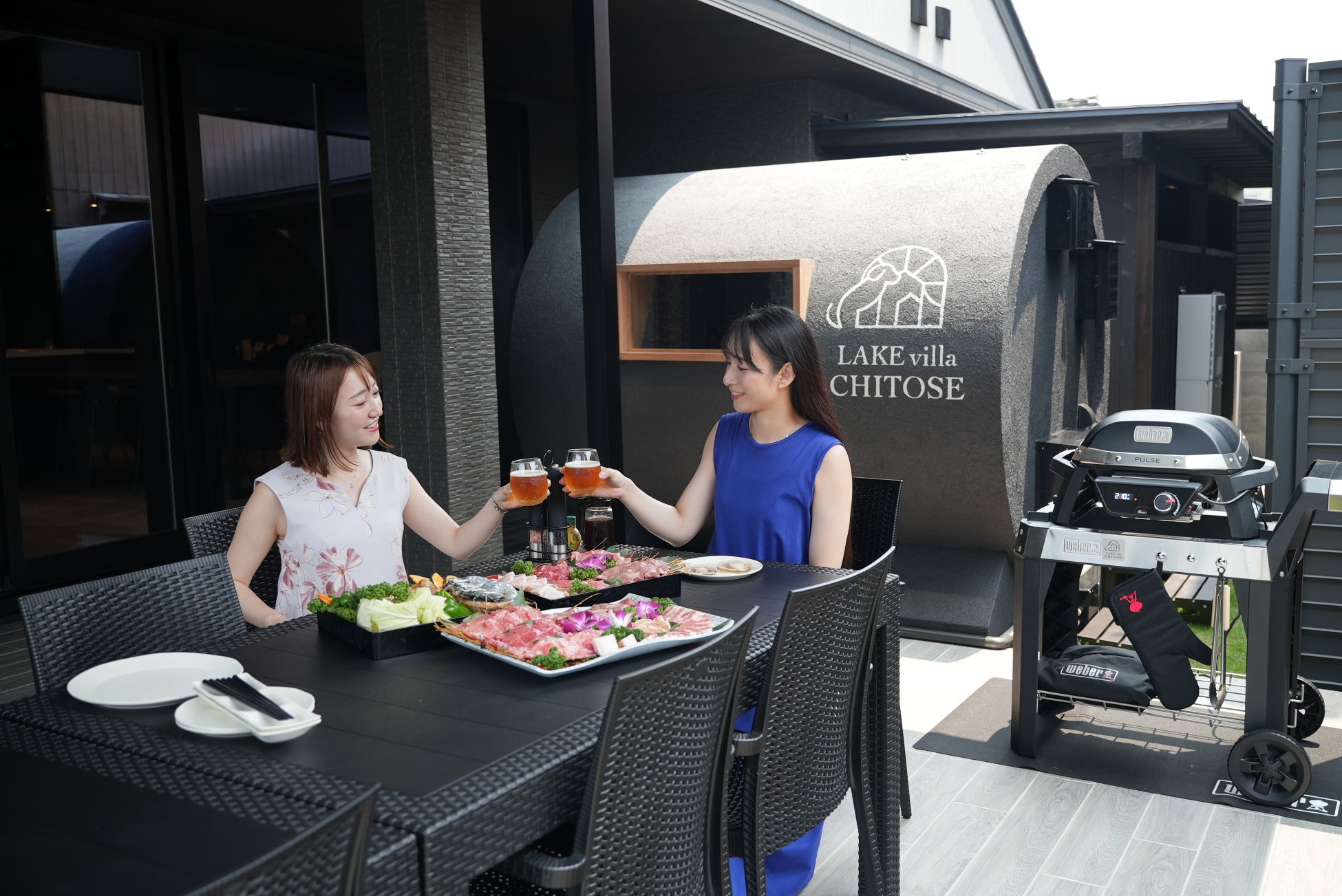 屋外には屋根付きBBQテラスを完備し、天候を問わずアウトドア料理を満喫可能。