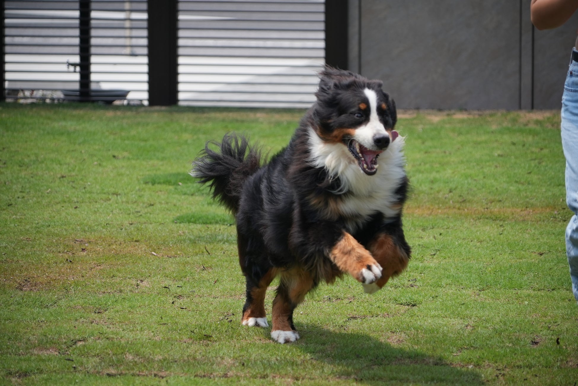 150坪以上の天然芝ドッグランは、高さのあるフェンスでぐるりと囲まれ、愛犬が自由に遊びながら、飼い主も安心して見守れる設計に。