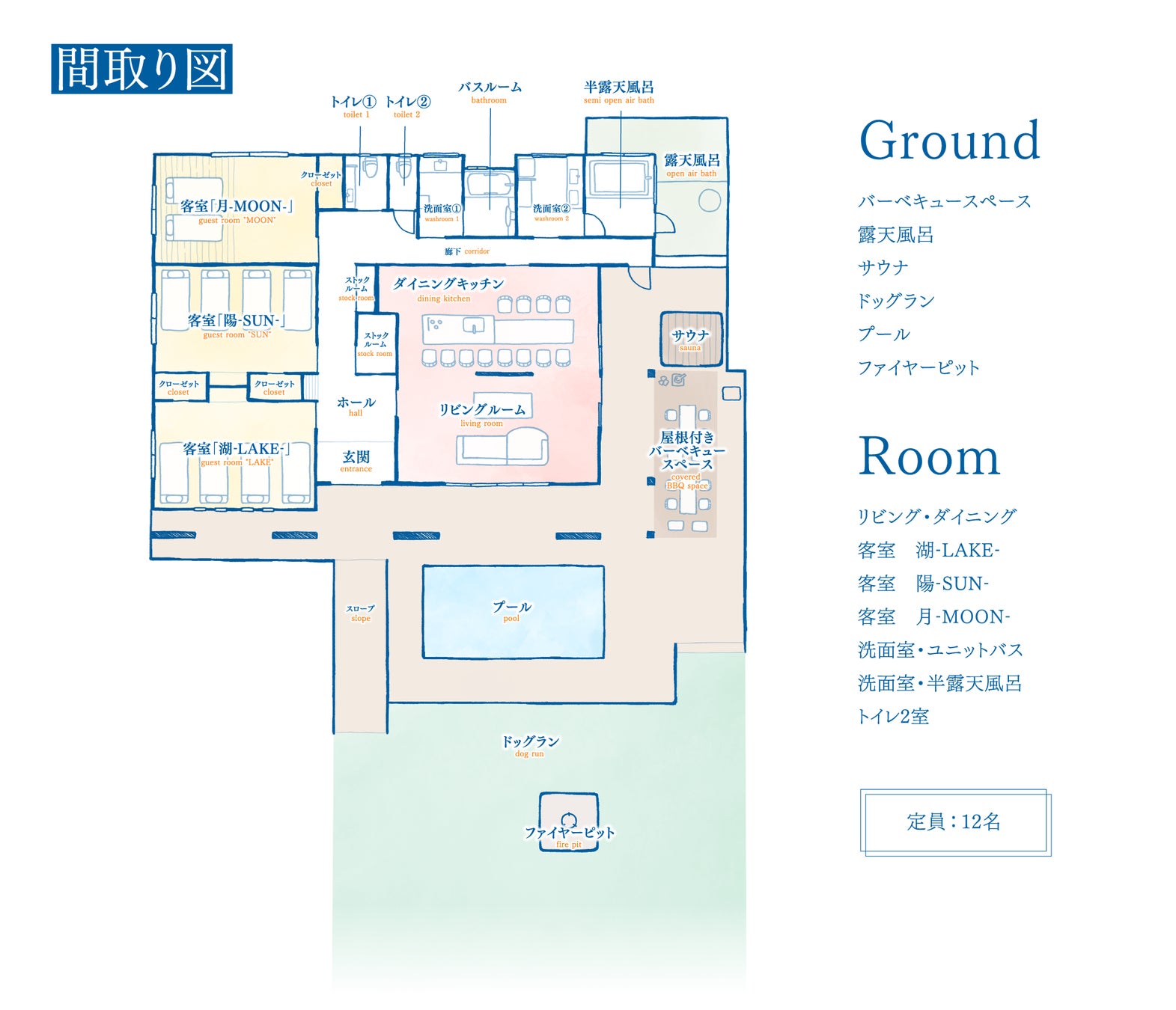 ●料⾦:1組限定、1泊1室150,000円(10名利⽤の場合)〜 1組最⼤12名までご宿泊可能