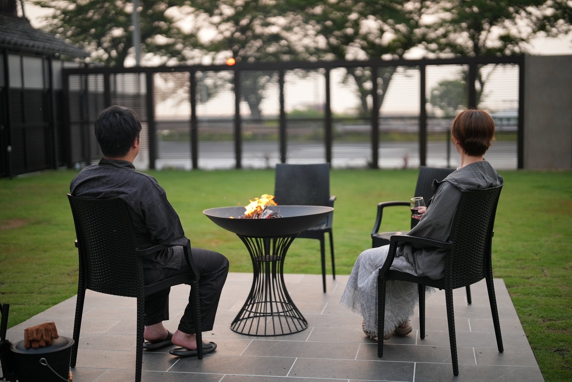夜は薪のファイヤーピットを囲んで、静かな癒しのひとときをお過ごしいただけます。