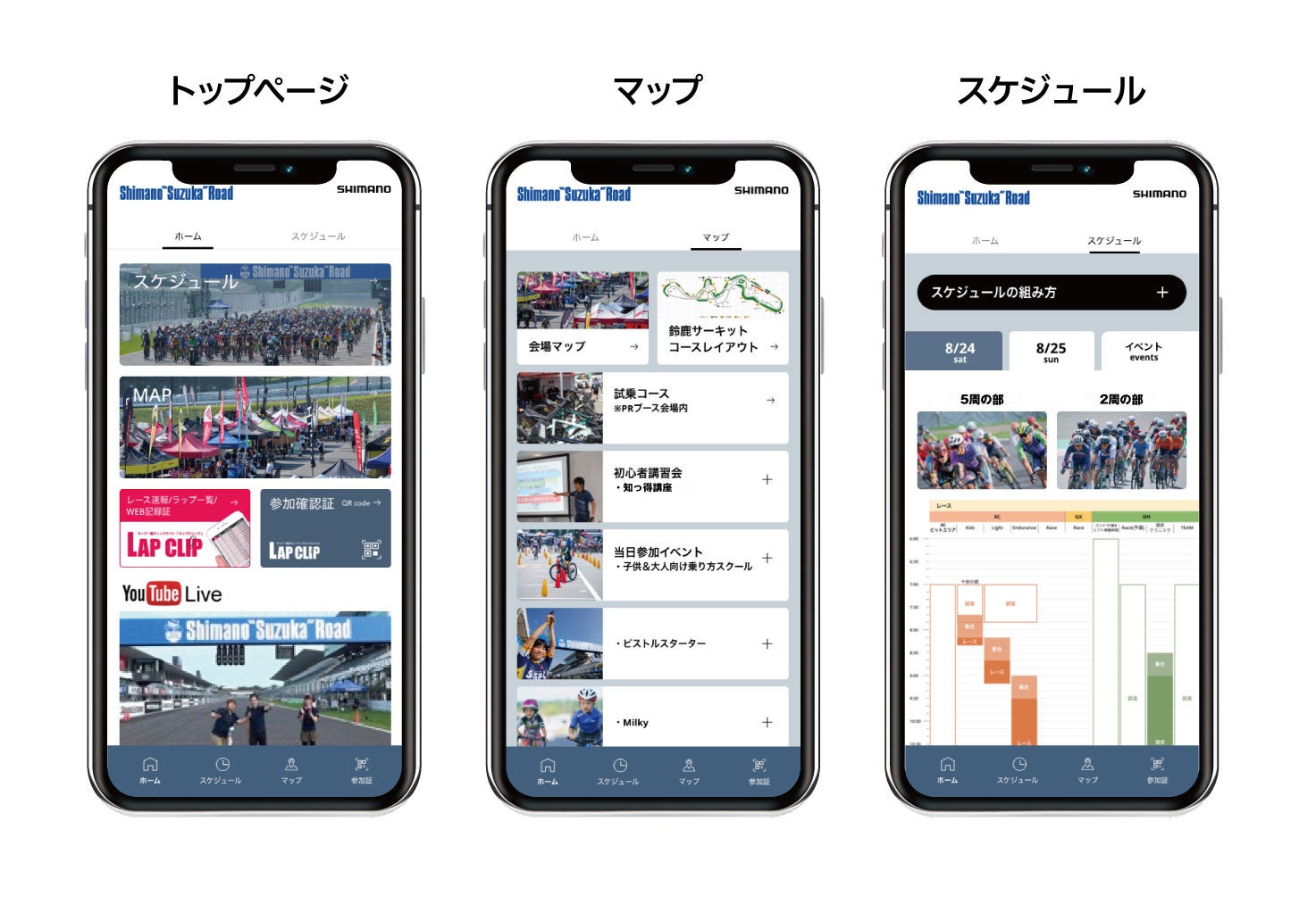 「シマノ鈴鹿ロード公式アプリ」では、会場の全体像や試乗コース、観戦エリアが一目でわかる「マップ」ページや、当日のレース、会場イベントが一覧で見られる「スケジュール」ページの他、自分が参加するレースやイベントを登録して、一日のスケジュールをチェックできる「マイスケジュール機能」を搭載しております。