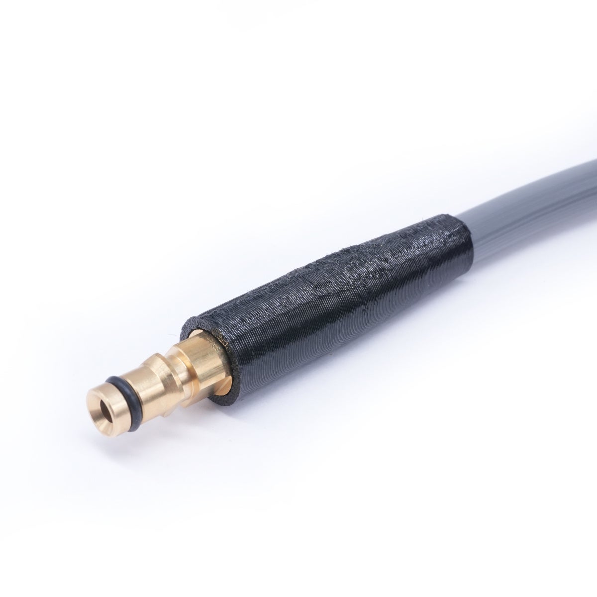 ホース本体は国内メーカーに特注したオリジナル品です。軽量樹脂製でありながら、巻きグセがなく、しなやかでねじれにくい特性を持ち、抜群の取り回しやすさを実現しました。コンクリート等で引きずっても跡が残りにくく、洗車にも最適です。
