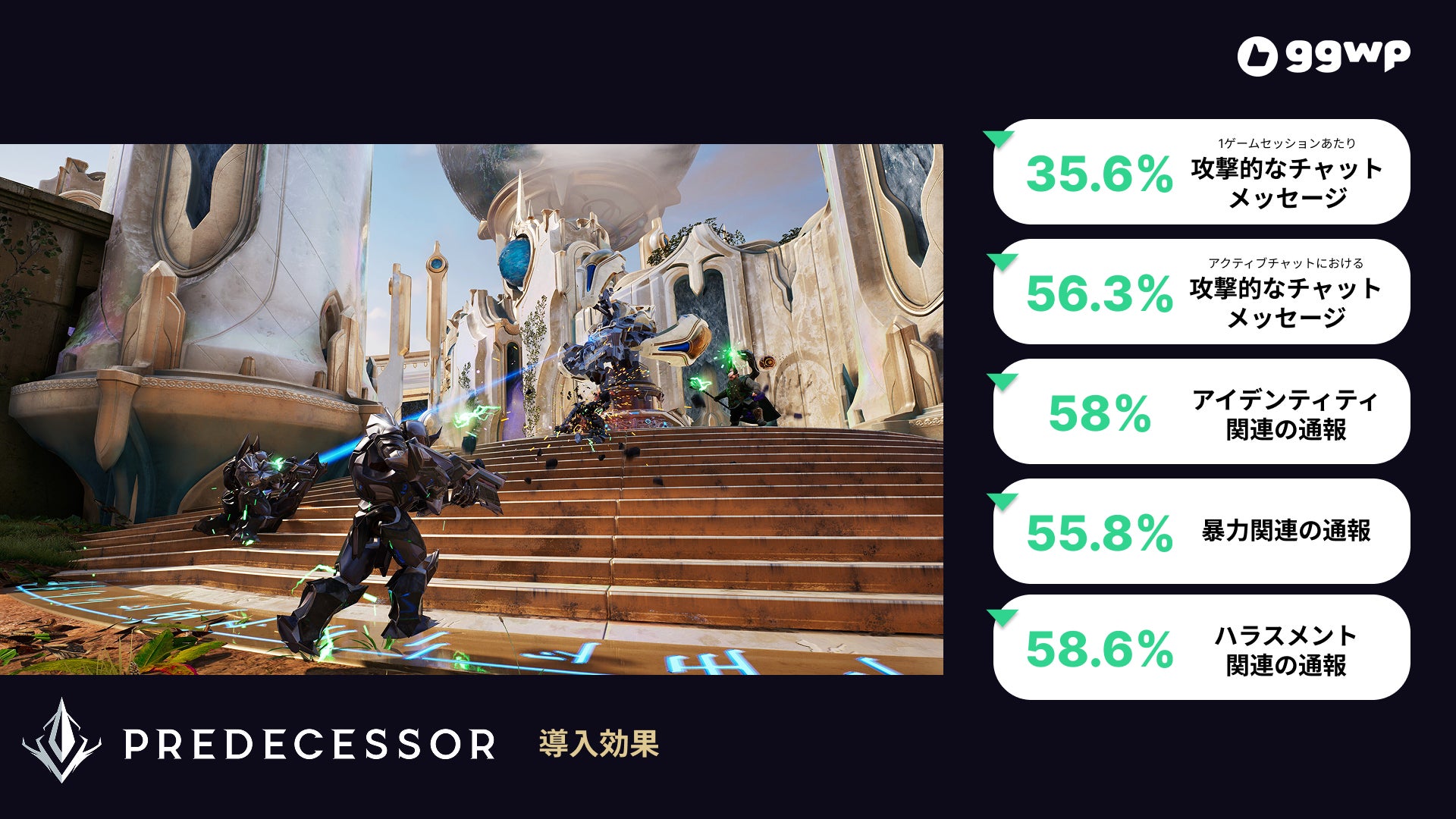 Omeda Studiosは、GGWPのモデレーションプラットフォーム導入後、以下の顕著な成果を上げています。Omeda Studiosは2020年に設立されたゲーム開発会社で、コミュニティ主導のアプローチで基本プレイ無料のマルチプレイヤーオンラインバトルアリーナMOBAゲーム「Predecessor」の開発しています。