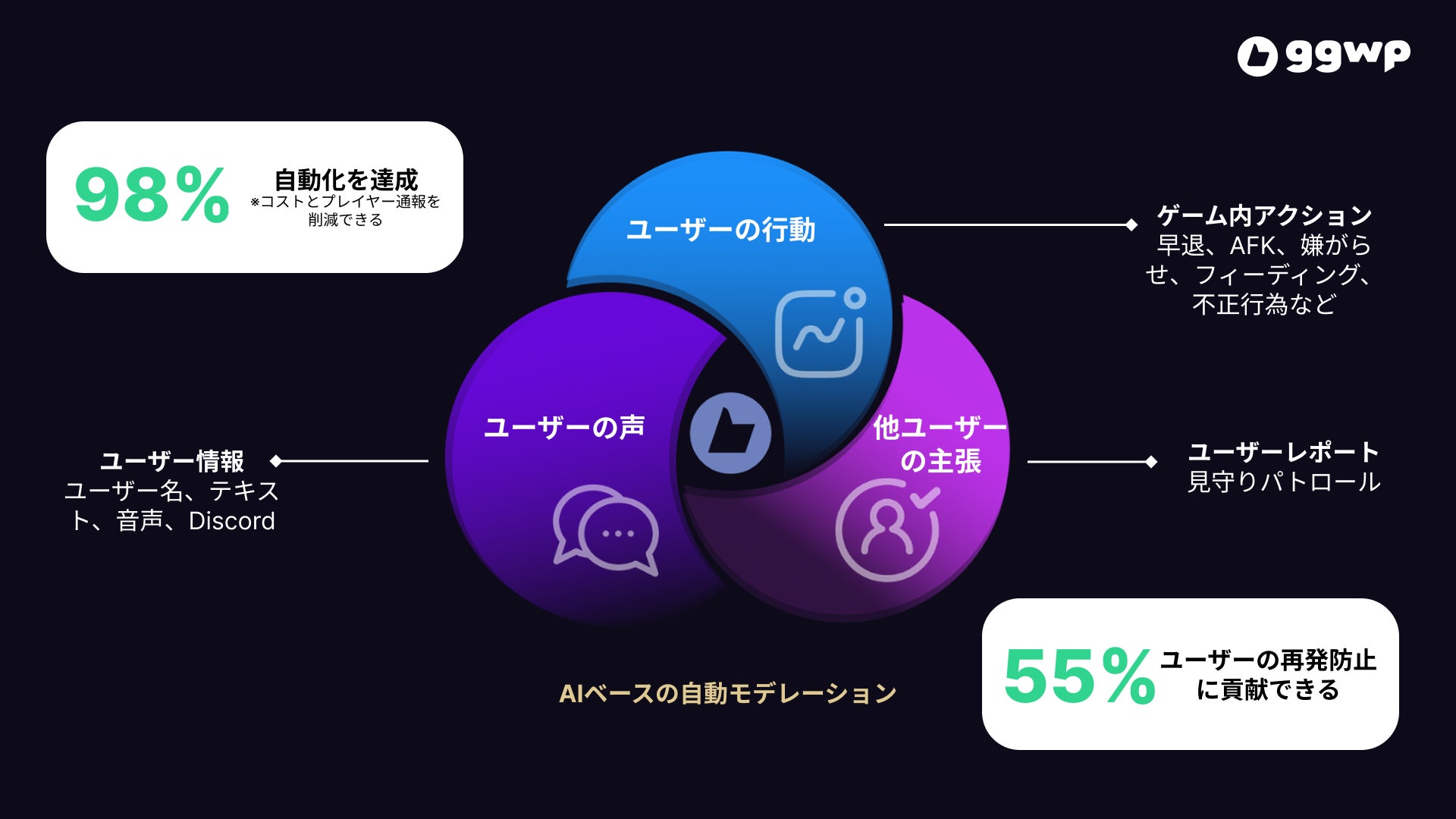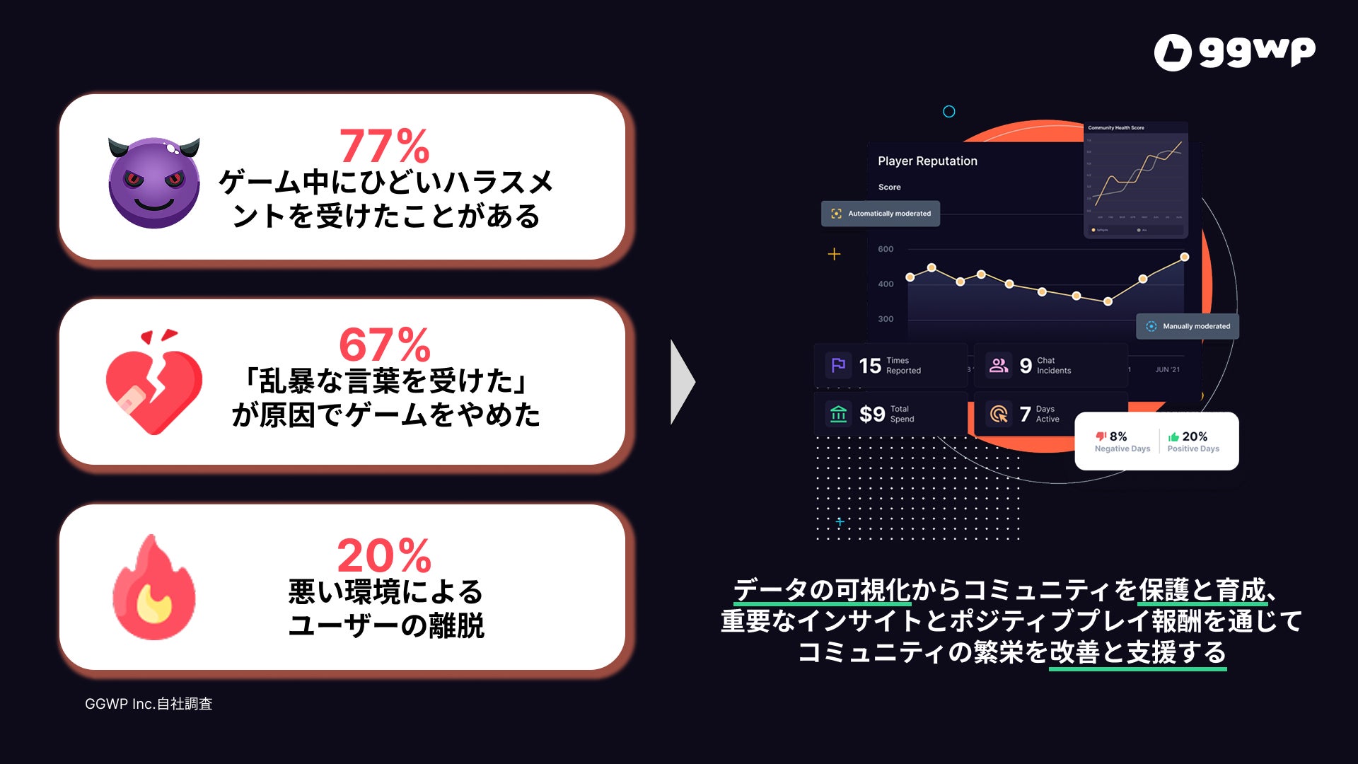 こうした背景を受け、GGWPは、AI技術と専門家によるサポートを組み合わせた最先端のモデレーションプラットフォームを提供することで、日本のゲームコミュニティの健全化に貢献し、ゲーム開発者の運営負担を軽減します。