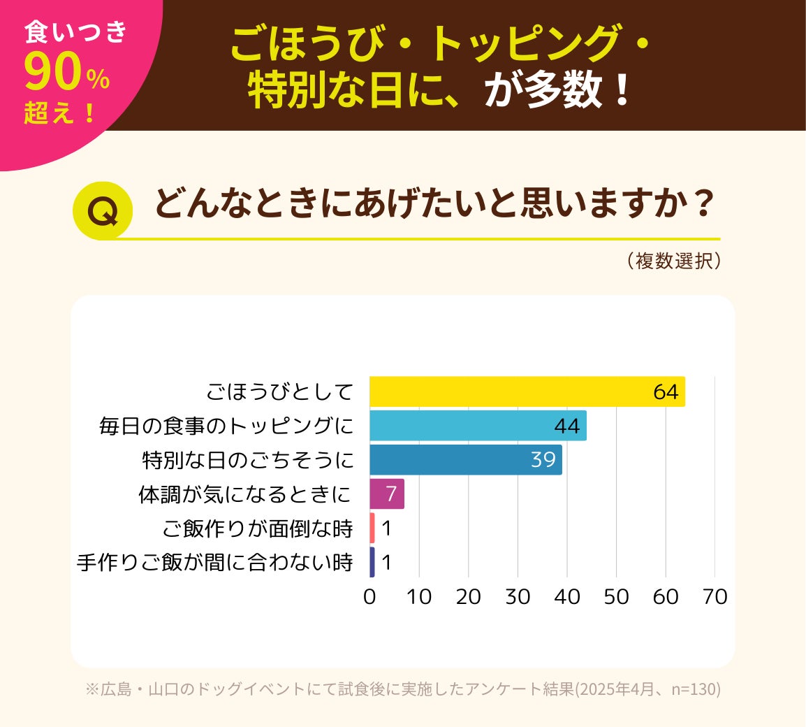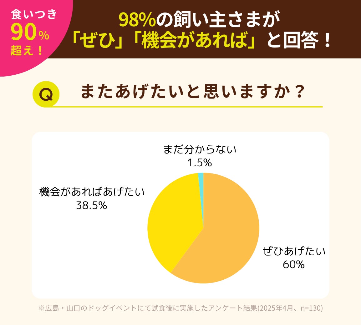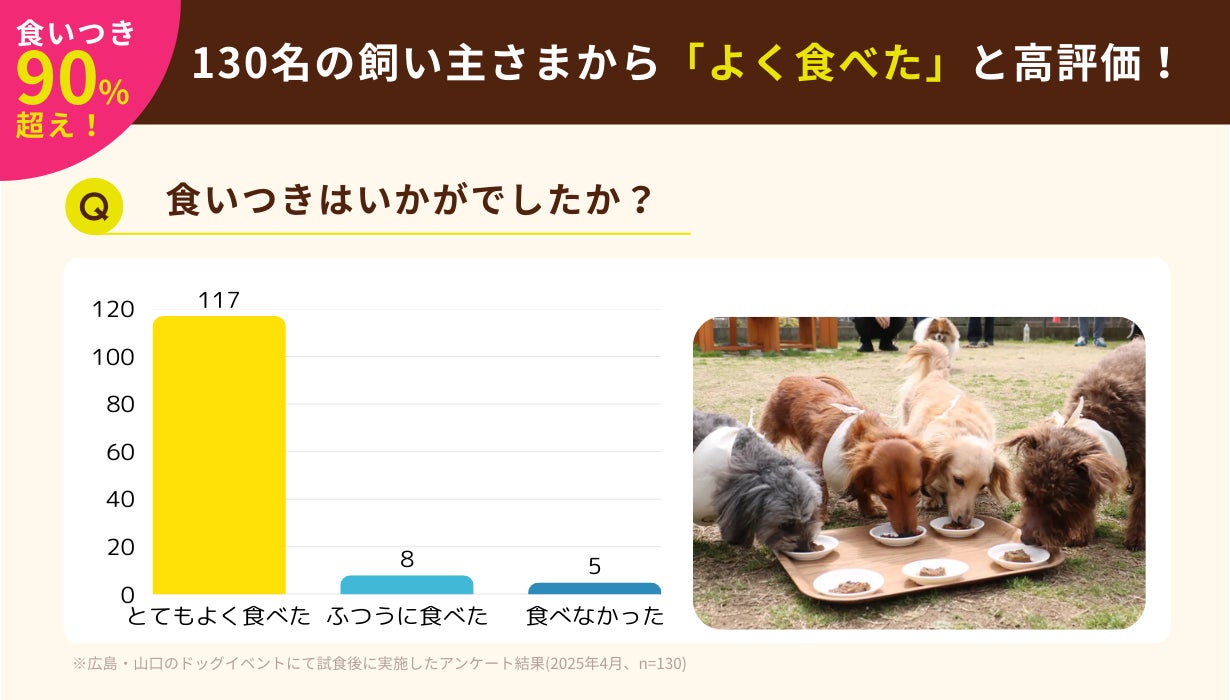 開発に先立ち実施した試食会では、130名の飼い主のうち90%以上が「とてもよく食べた」と回答。「ごほうびや特別な日にあげたい」「冷凍でも使いやすい」などの声も多く寄せられ、実際の感想からは、「お野菜たっぷりで美味しそうでした」「食べると嬉しい」などの温かい反応がありました。