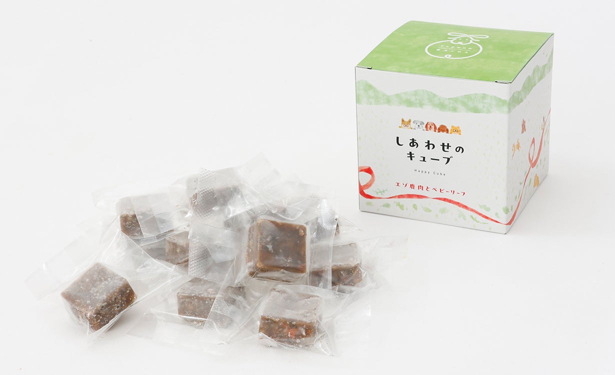 その第一弾商品として、北海道産エゾシカに加え、自社有機農場で栽培したベビーリーフなどを使用した、無添加・冷凍・個包装のフレッシュフード『しあわせのキューブ』を開発。
