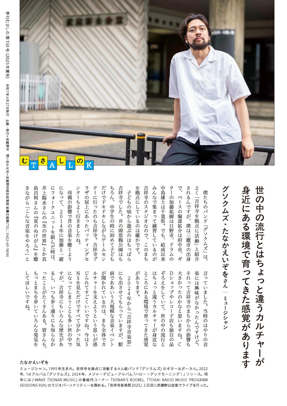 裏表紙「むさしのTALK」は武蔵野市ゆかりの著名人・文化人のインタビューを毎号掲載。今回は吉祥寺を拠点に活動するバンド「グソクムズ」のたなかえいぞをさんが登場しています。