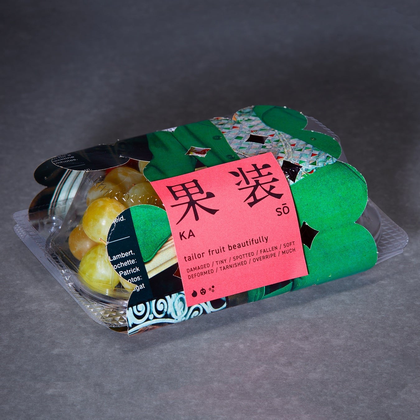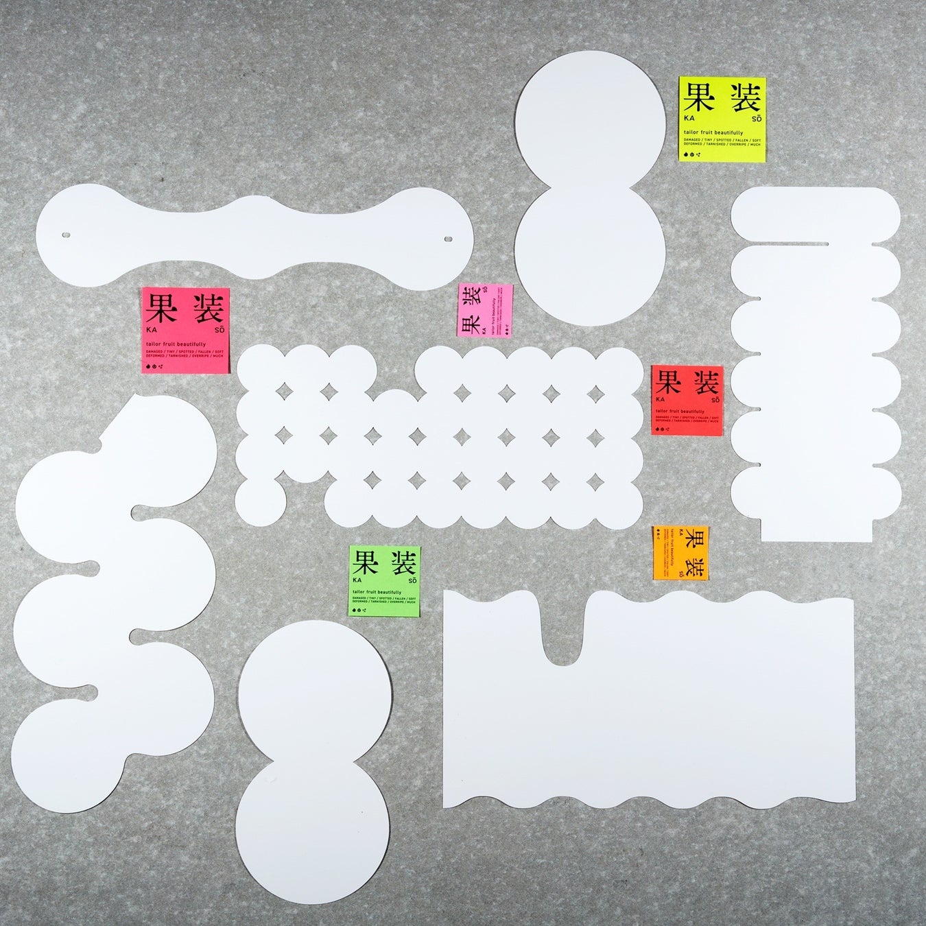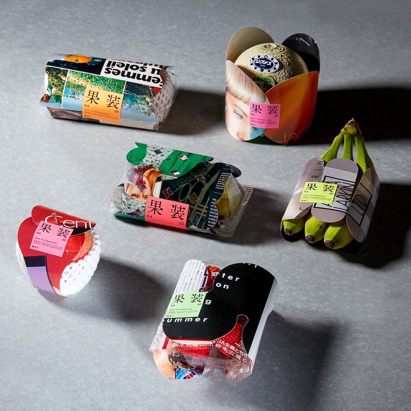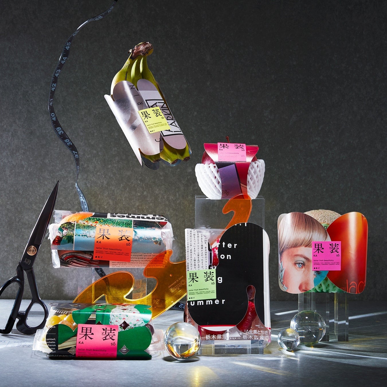 果物の不完全さや不揃いな形を個性の表現として受け入れ、普段ははじかれてしまう果実たちに新たな価値を与えるデザインです。日本各地の農家から集められた不揃いな形の果実たちを、それぞれの形に合わせた古い本や雑誌の再利用紙で丁寧に包みます。果実ごとに選ばれた鮮やかなタグが、遊び心とブランドの統一感を添えます。まるでオーダーメイドの衣服を仕立てるように、優しく丁寧なこのアプローチは、温かさや思いやり、そして持続可能性の精神に満ちたパッケージ体験を生み出します。