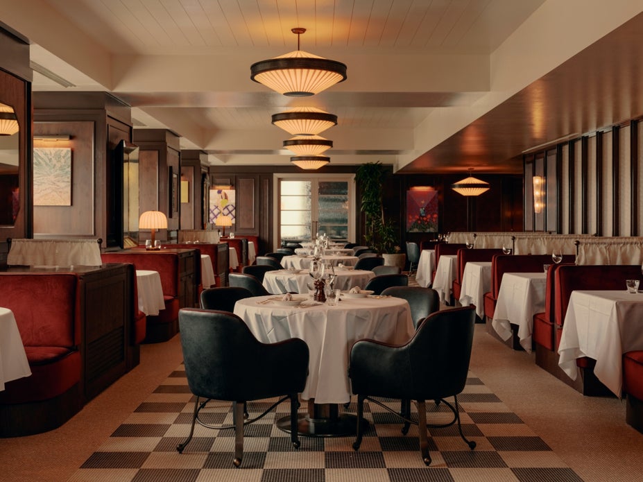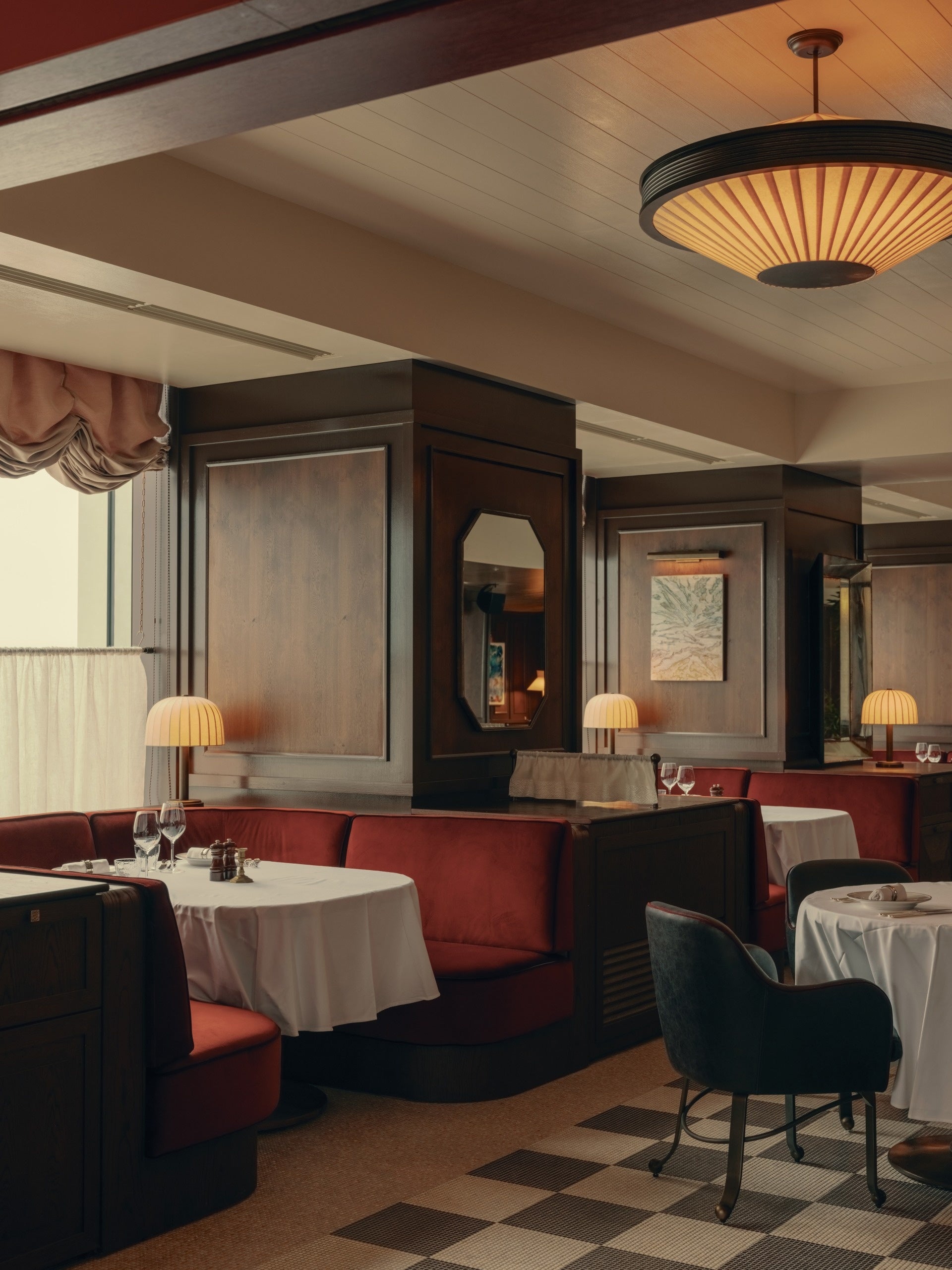 ハウスキッチンは、バーガンディのベルベットを張ったベンチシートを中心に、ムラーノ製の照明とバールウッドの羽目板で落ち着いた雰囲気に仕上がりました。ソーホーハウスの象徴的な大理石床の意匠を名古屋のセラミックタイルで再解釈、大理石トップのテーブルとのコントラストで印象を残します。
