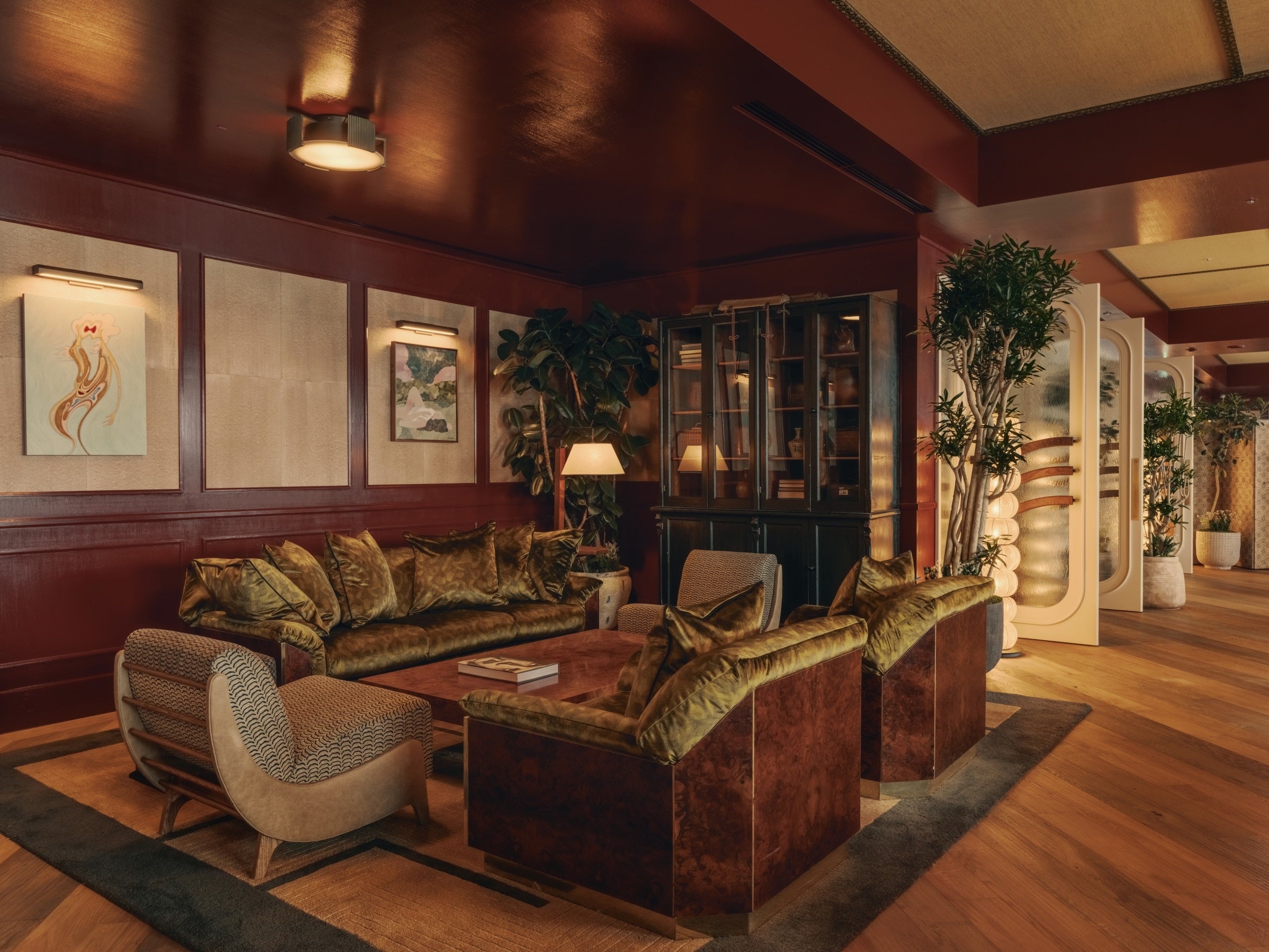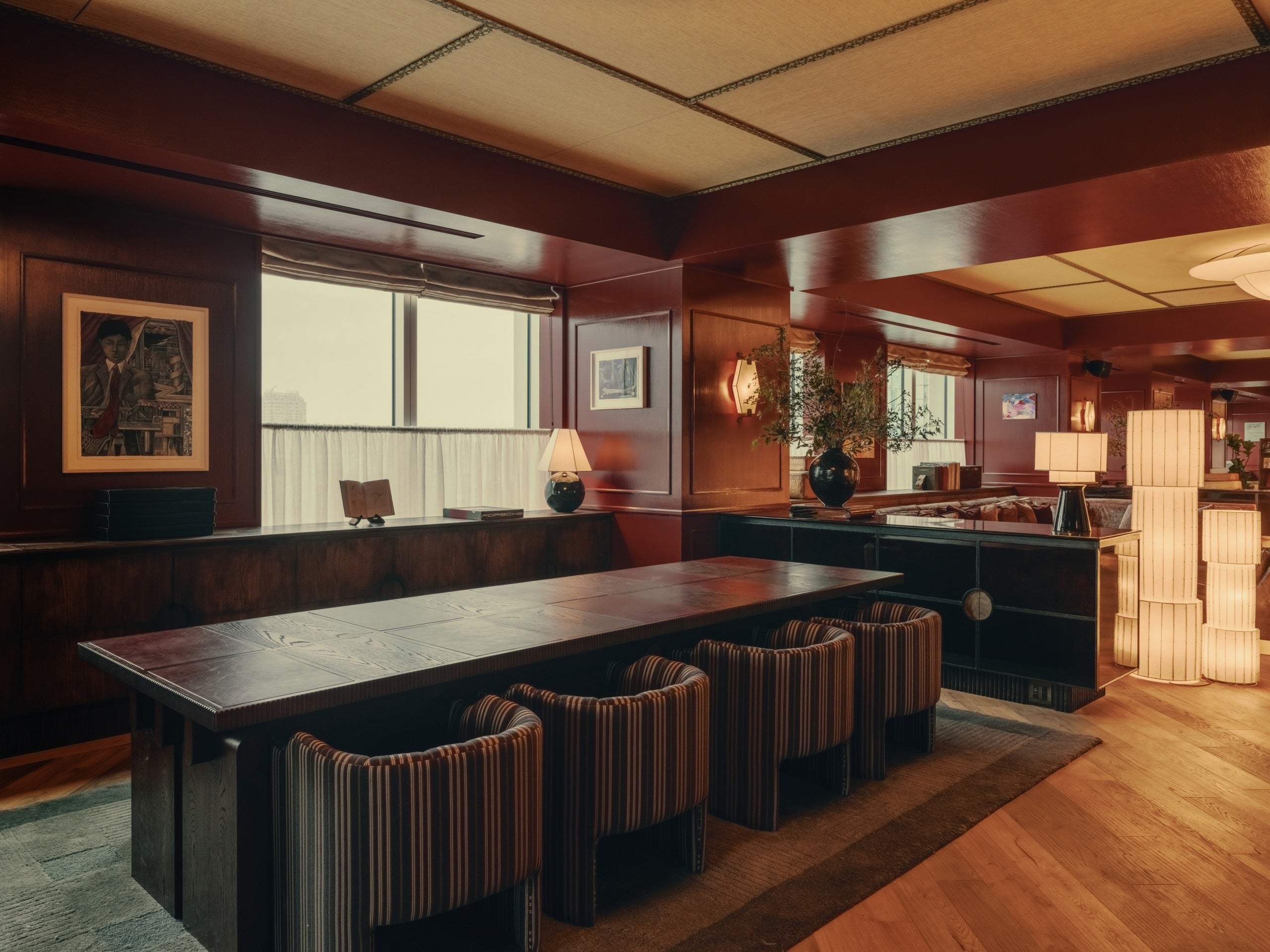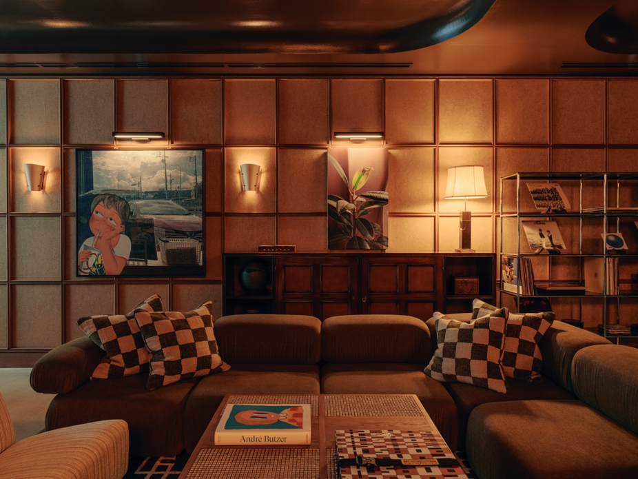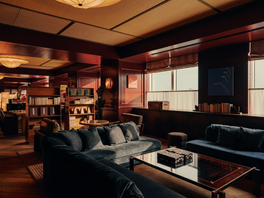 1階のメインエントランスからハウス内へ一歩足を踏み入れると、広々としたレセプションエリアがメンバーをお迎えします。ムーディーで温もりのあるアースカラーのカラーパレットが、館内全体へとシームレスに連なり、一貫した世界観が空間を包み込みます。大阪で特注された照明が存在感を放ち、レセプションデスクには京都の牧野漆工芸による漆パネルを採用。さらにKAMISMによる手漉き和紙で仕上げられた壁面が、日本のクラフトの奥行きを物語ります。