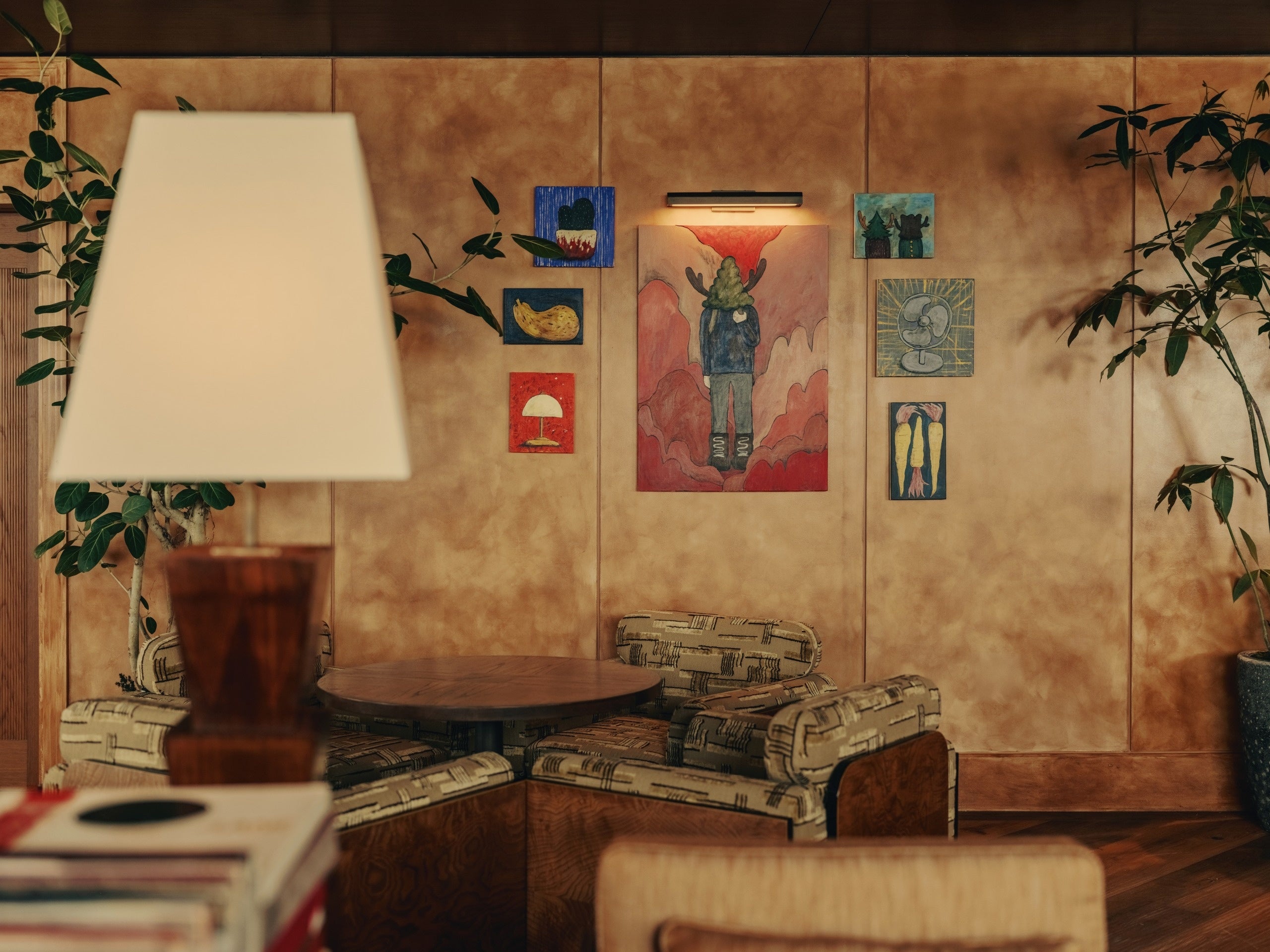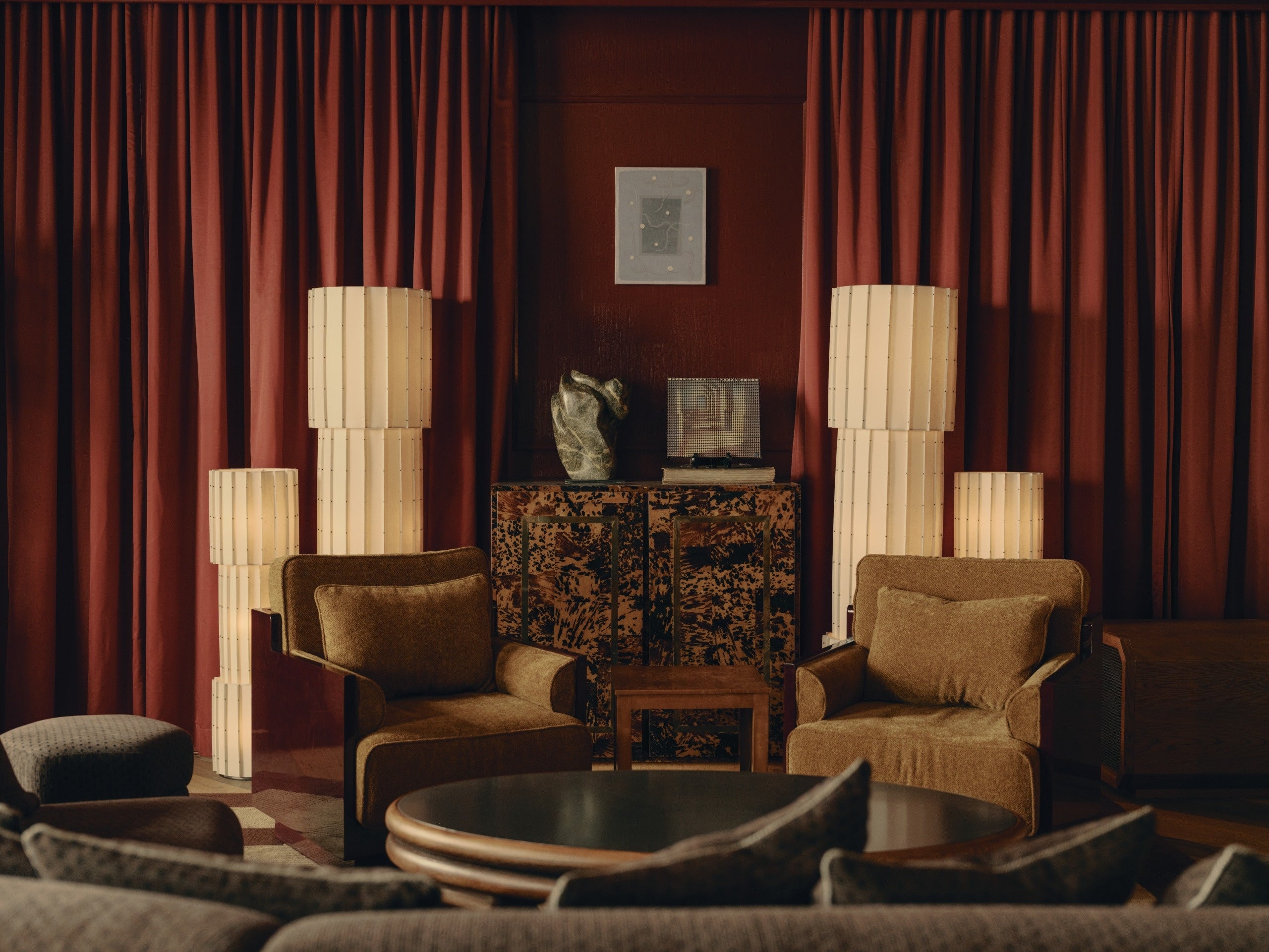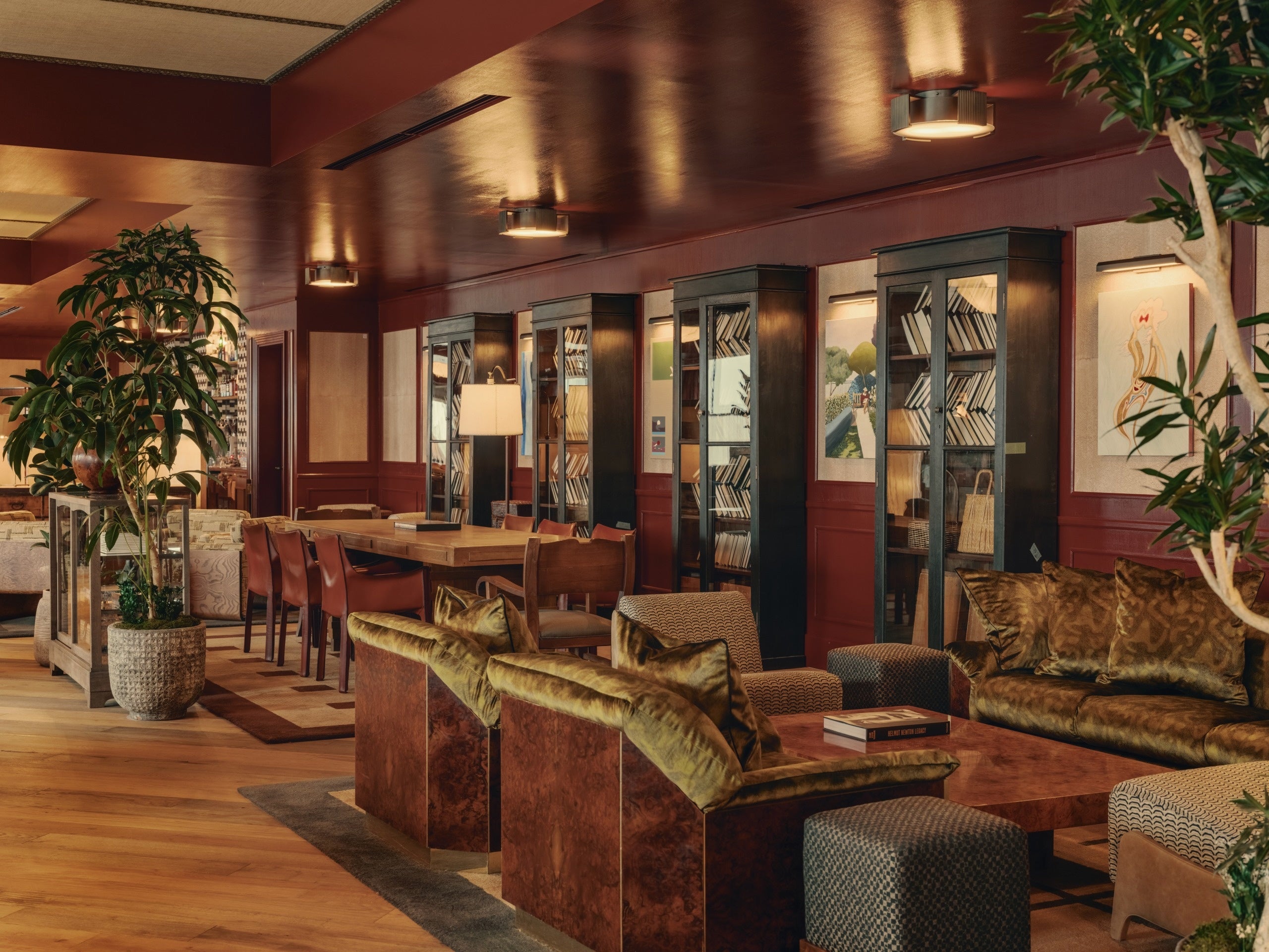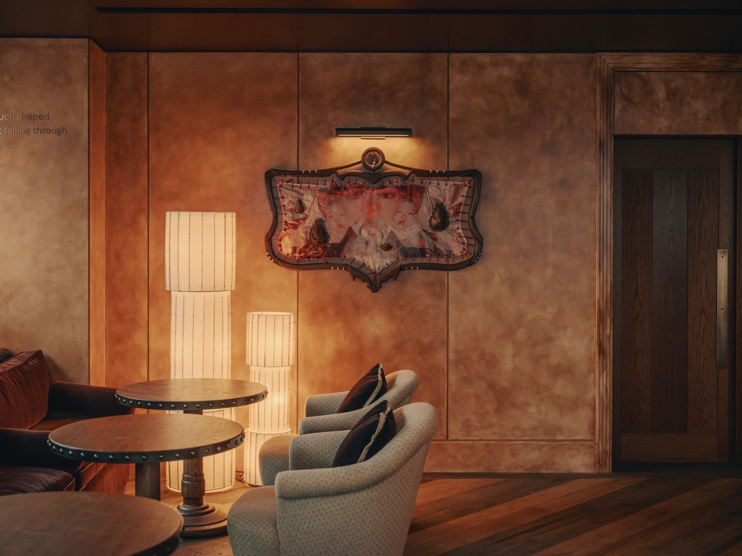 1階のメインエントランスからハウス内へ一歩足を踏み入れると、広々としたレセプションエリアがメンバーをお迎えします。ムーディーで温もりのあるアースカラーのカラーパレットが、館内全体へとシームレスに連なり、一貫した世界観が空間を包み込みます。大阪で特注された照明が存在感を放ち、レセプションデスクには京都の牧野漆工芸による漆パネルを採用。さらにKAMISMによる手漉き和紙で仕上げられた壁面が、日本のクラフトの奥行きを物語ります。