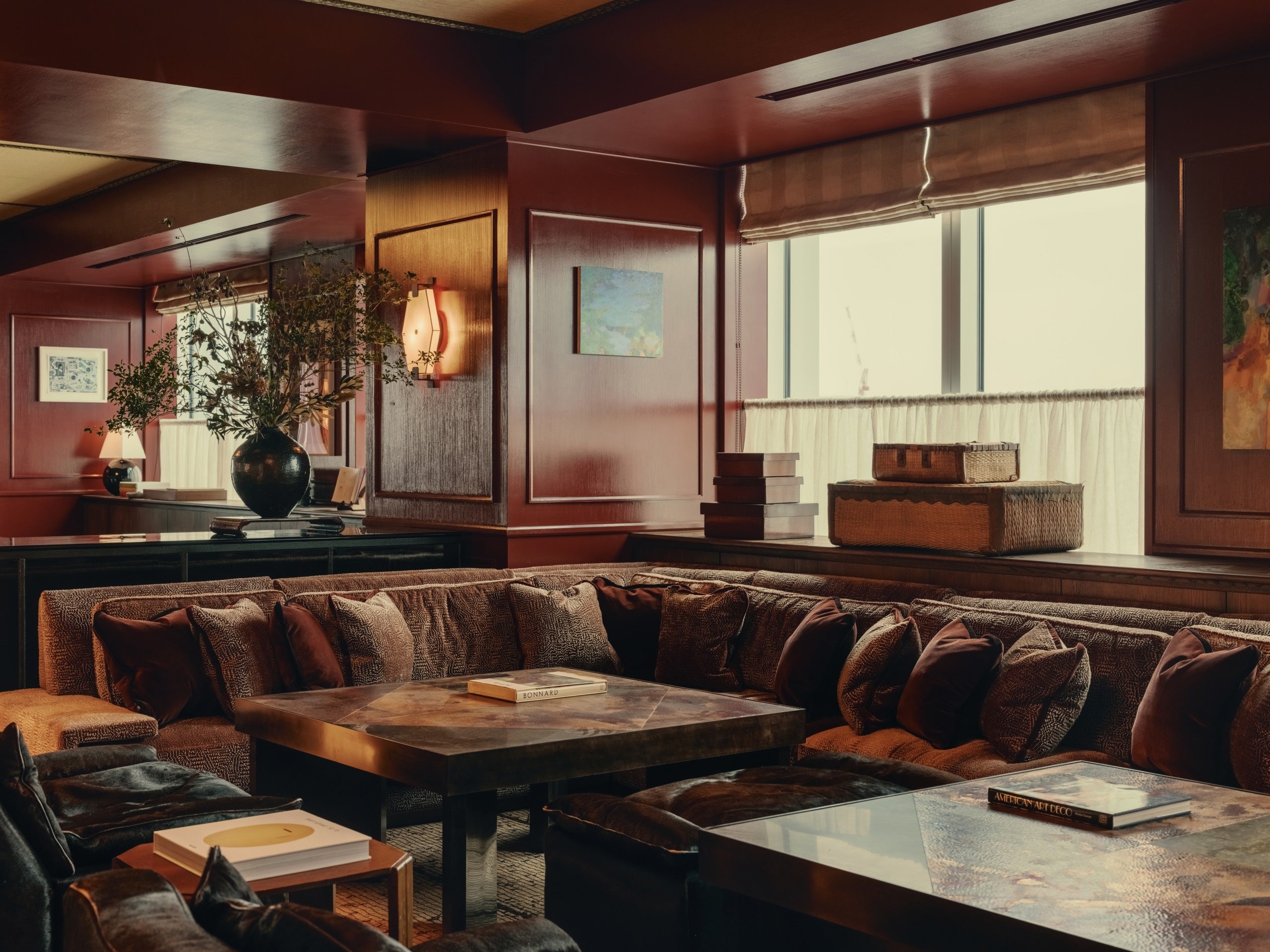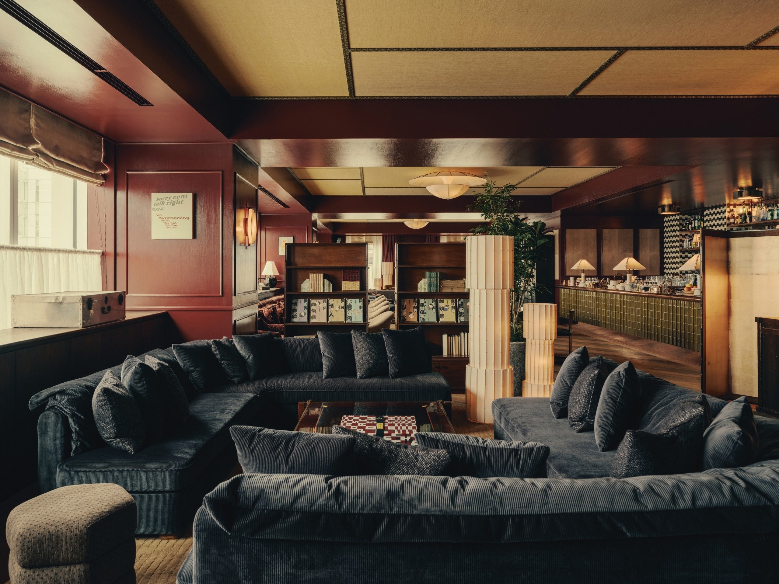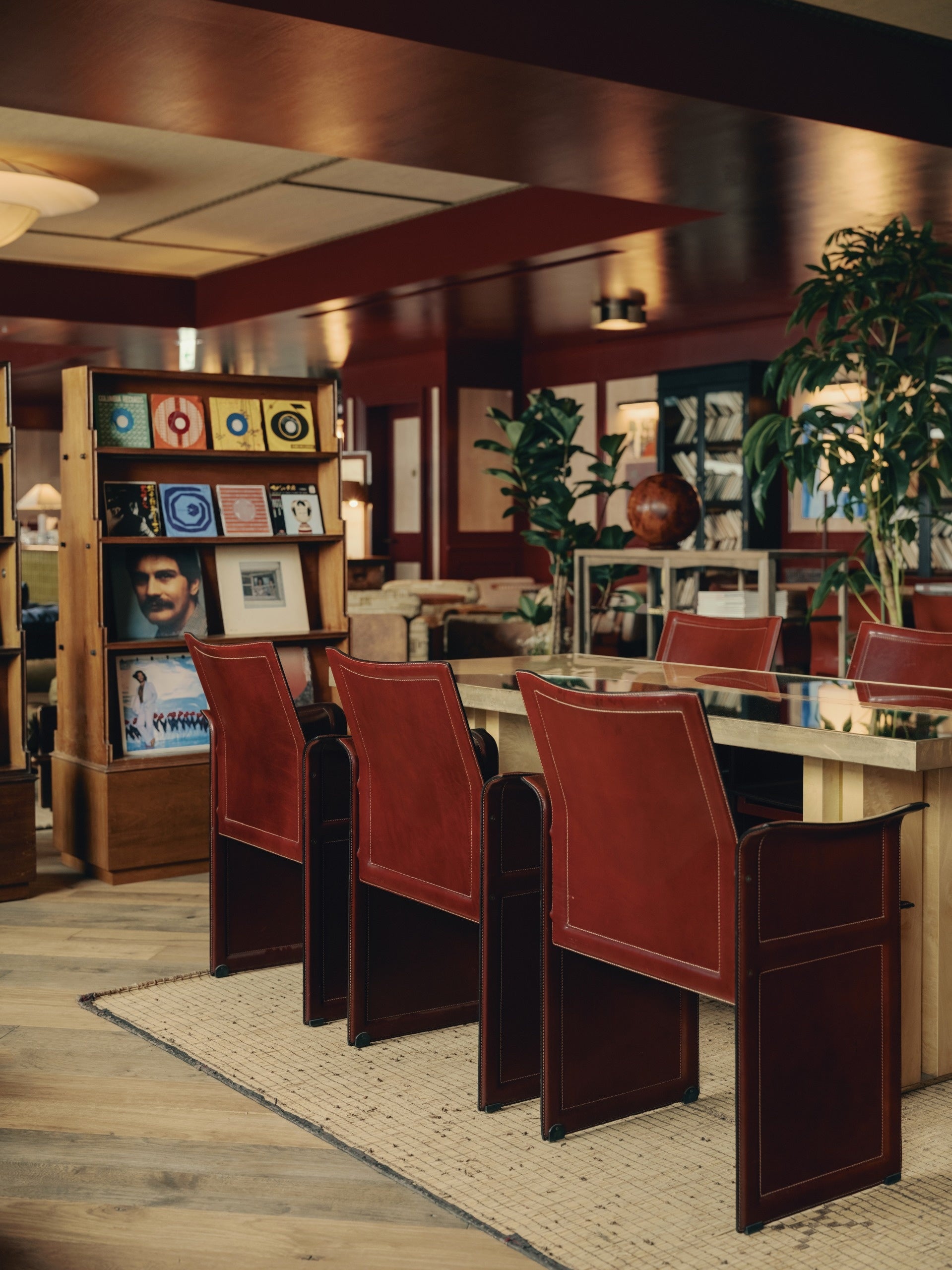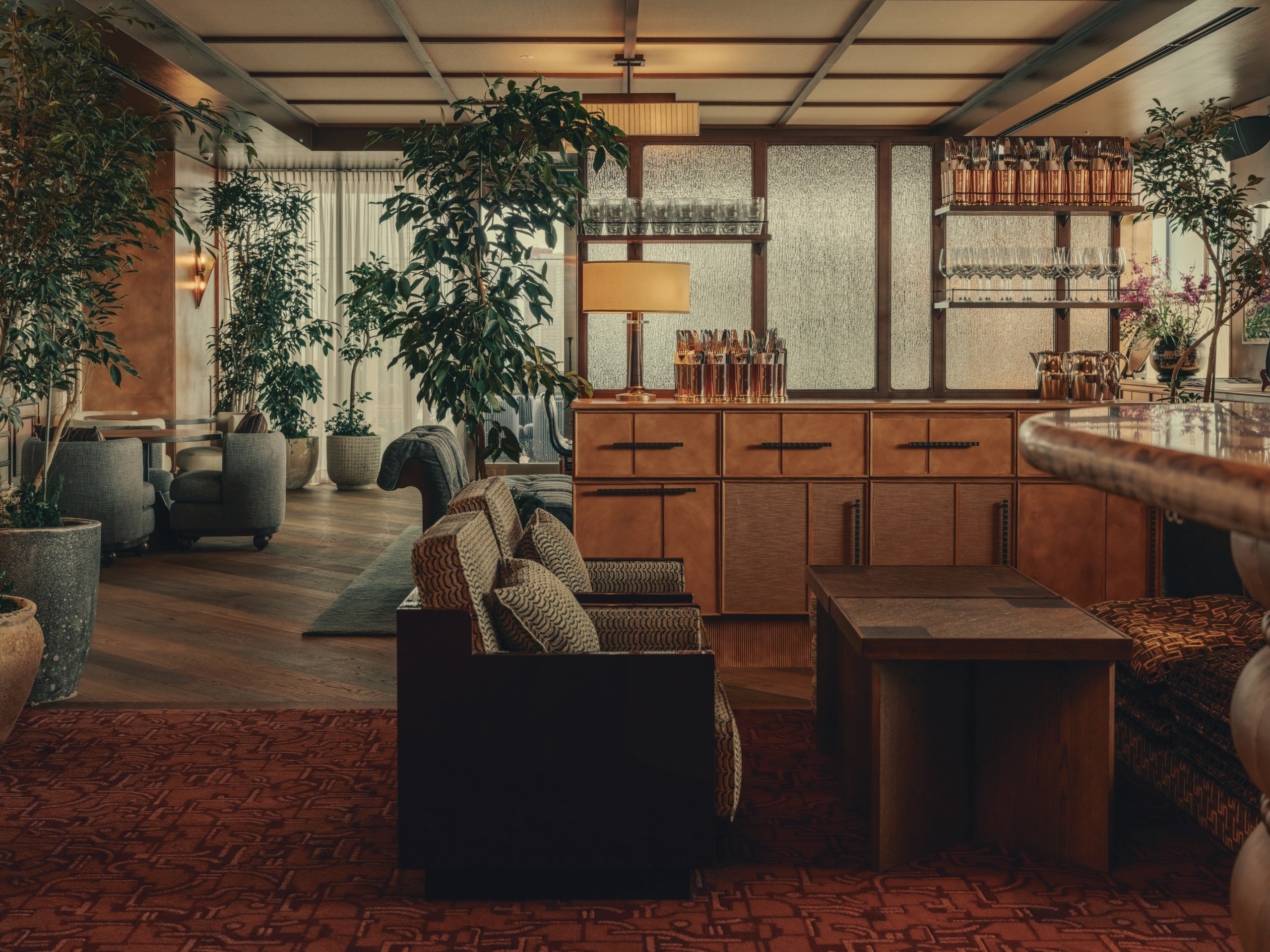 フロア間の移動は専用エレベーターのほか、13階と14階をつなぐ螺旋階段もご利用いただけます。13階のクラブラウンジは、日本の伝統的な漆をイメージした深いバーガンディレッドの色調と、英国らしいクラシカルな羽目板とのコントラストで印象的な空間が広がります。天井には畳のパターンをモチーフにした意匠を施し、畳縁のディテールを取り入れました。また、英国、ヨーロッパ、そして日本から厳選されたヴィンテージ家具が随所に配され、クラブフロアに豊かな表情を生み出しています。日本の屋根瓦を再解釈したデザインをフロントに取り入れたバーが、独自の存在感を演出。ソフトなラウンジシートやレザーソファ、テーブル席、ベンチシートなど多様なシーティングで、思い思いの時間を過ごせる空間です。