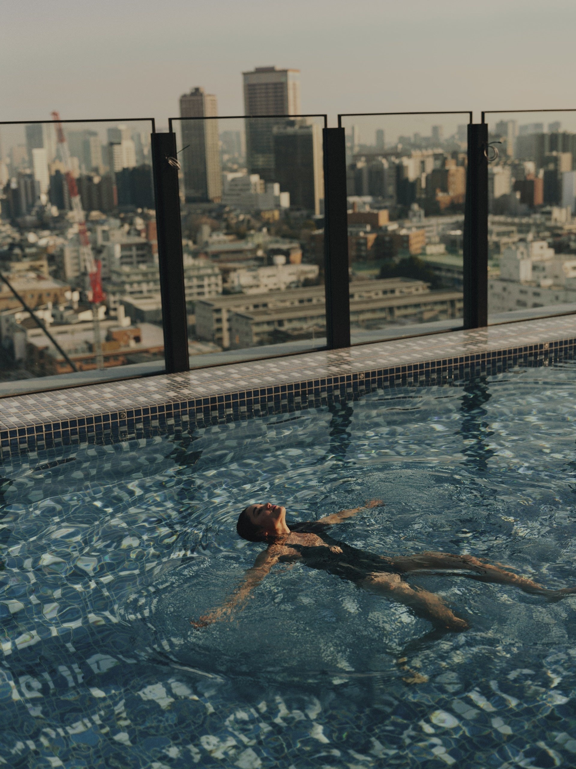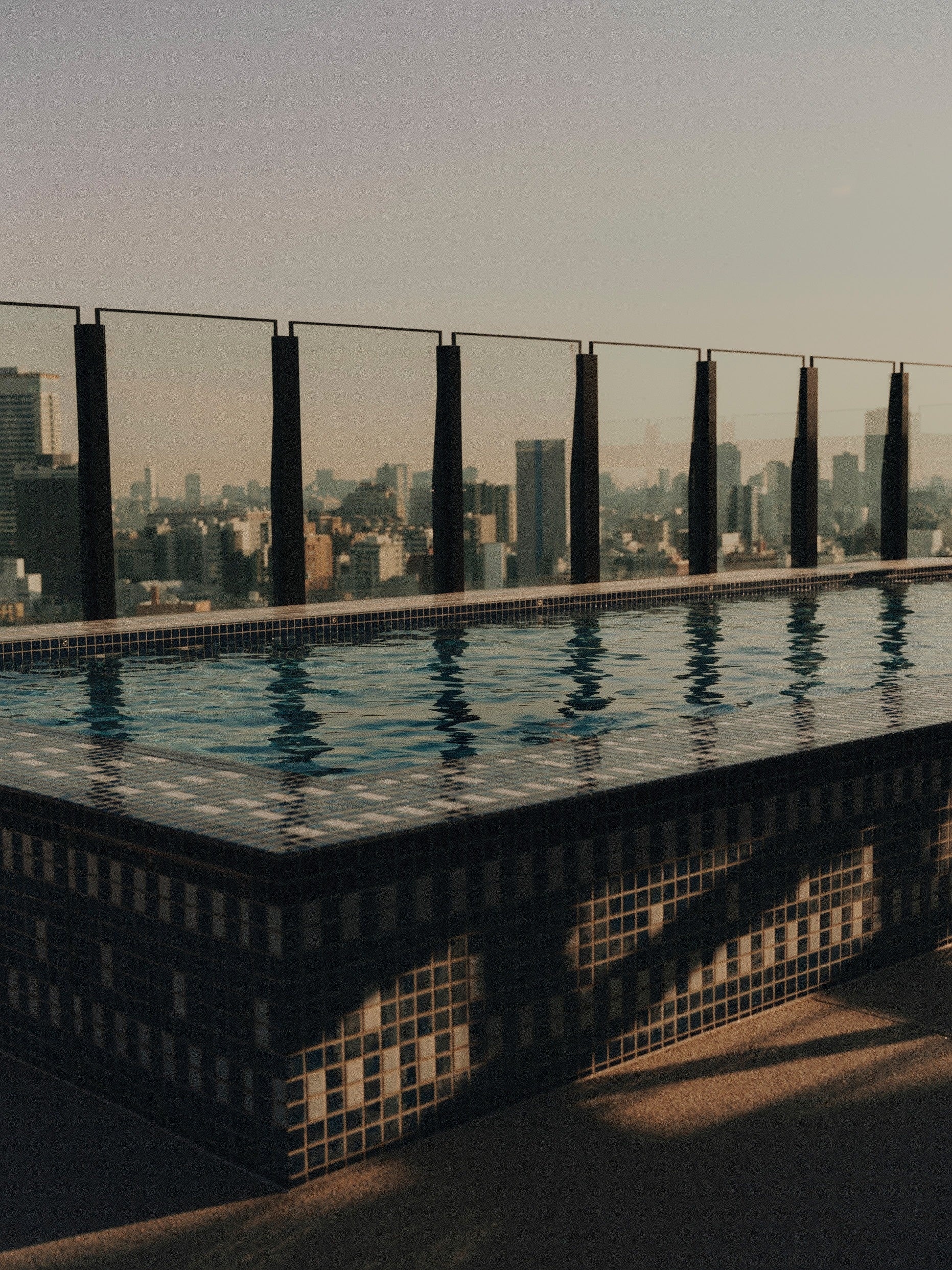 プールテラスには、ラウンジ席とダイニング席がバランスよく配され、東京の街並みを眺めながら、食事、ドリンクだけでなく、リラックスした時間を楽しめるスペースです。約4000 sq ftのインフィニティプールには、岐阜・多治見で製作された藍と白の特注タイルを採用。サンラウンジャーやデイベッドには、ソーホーハウス東京限定のシグネチャーストライプタオルが並びます。デイベッドのパターンは、麻の葉や立涌といった着物の幾何学文様から着想を得た特注デザイン。テラスの両端には、日本庭園でも馴染みが深いツゲの木が静かに佇んでいます。