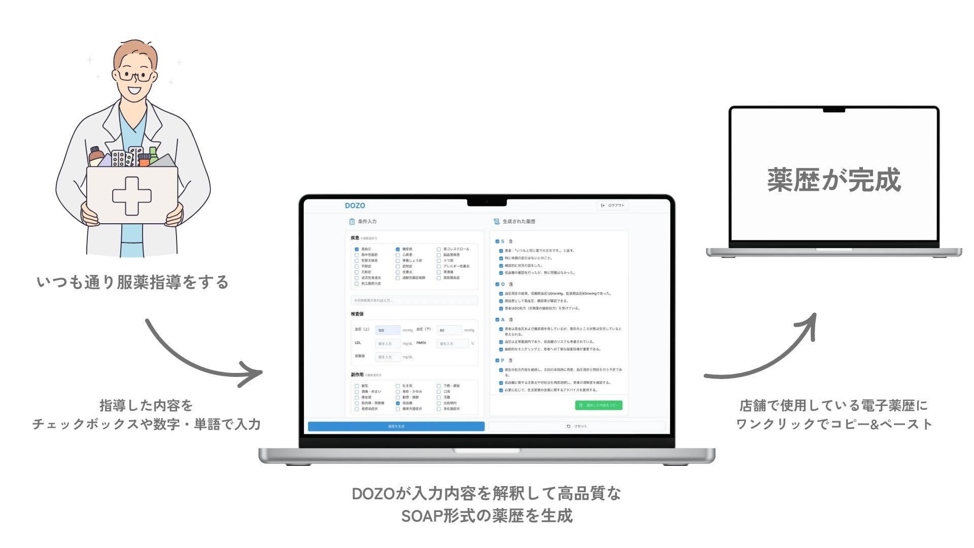 DOZOは、チェックボックスをつけたりや単語を入力したりするだけで、高品質なSOAP文章が出来上がる薬歴サポートAIで、できた薬歴を店舗でお使いの電子薬歴にコピー&ペーストするだけで薬歴が完成するシステムです。