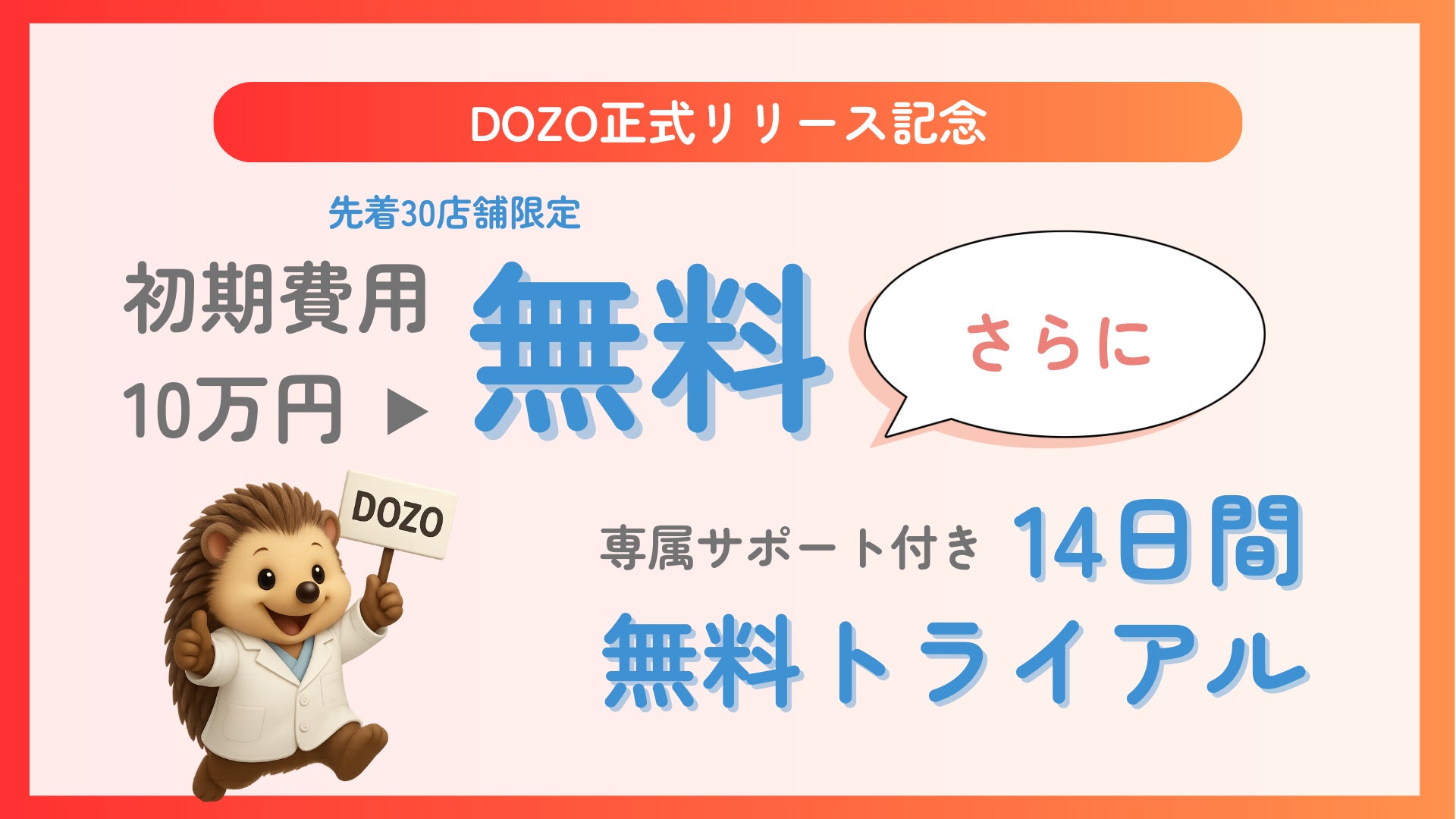「DOZO」のリリースを記念し、ご契約時の初期費用(100,000円)が無料となるキャンペーンを実施します。また14日間の無料トライアルも実施しておりますので、本番環境でぜひご活用いただき、その上で継続利用をご判断ください。