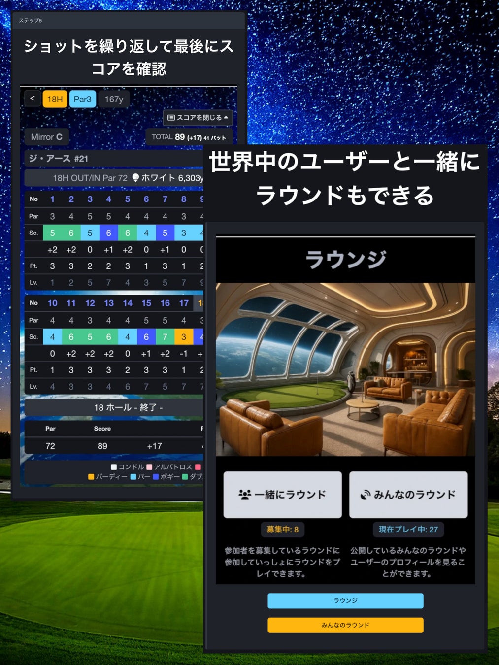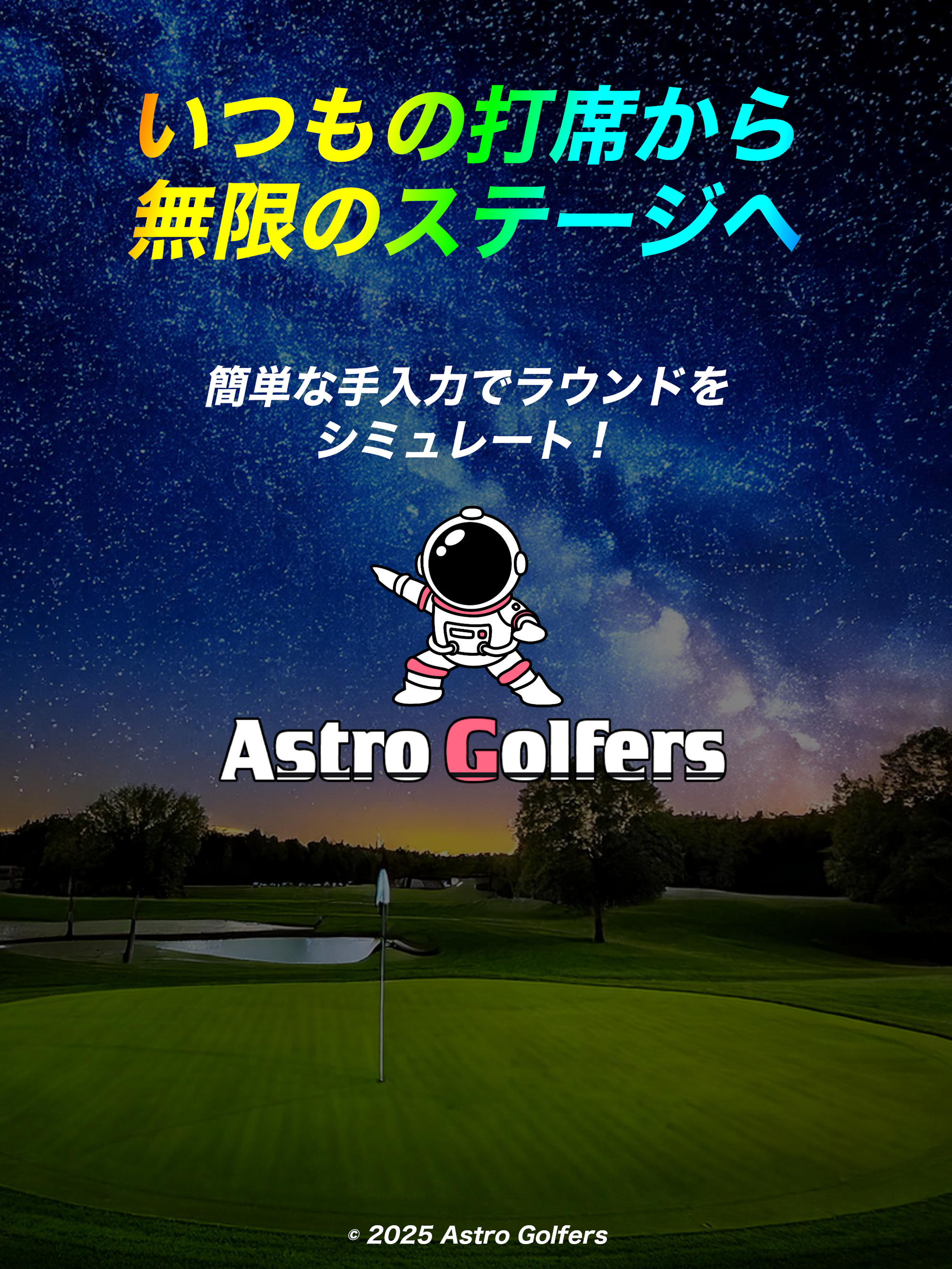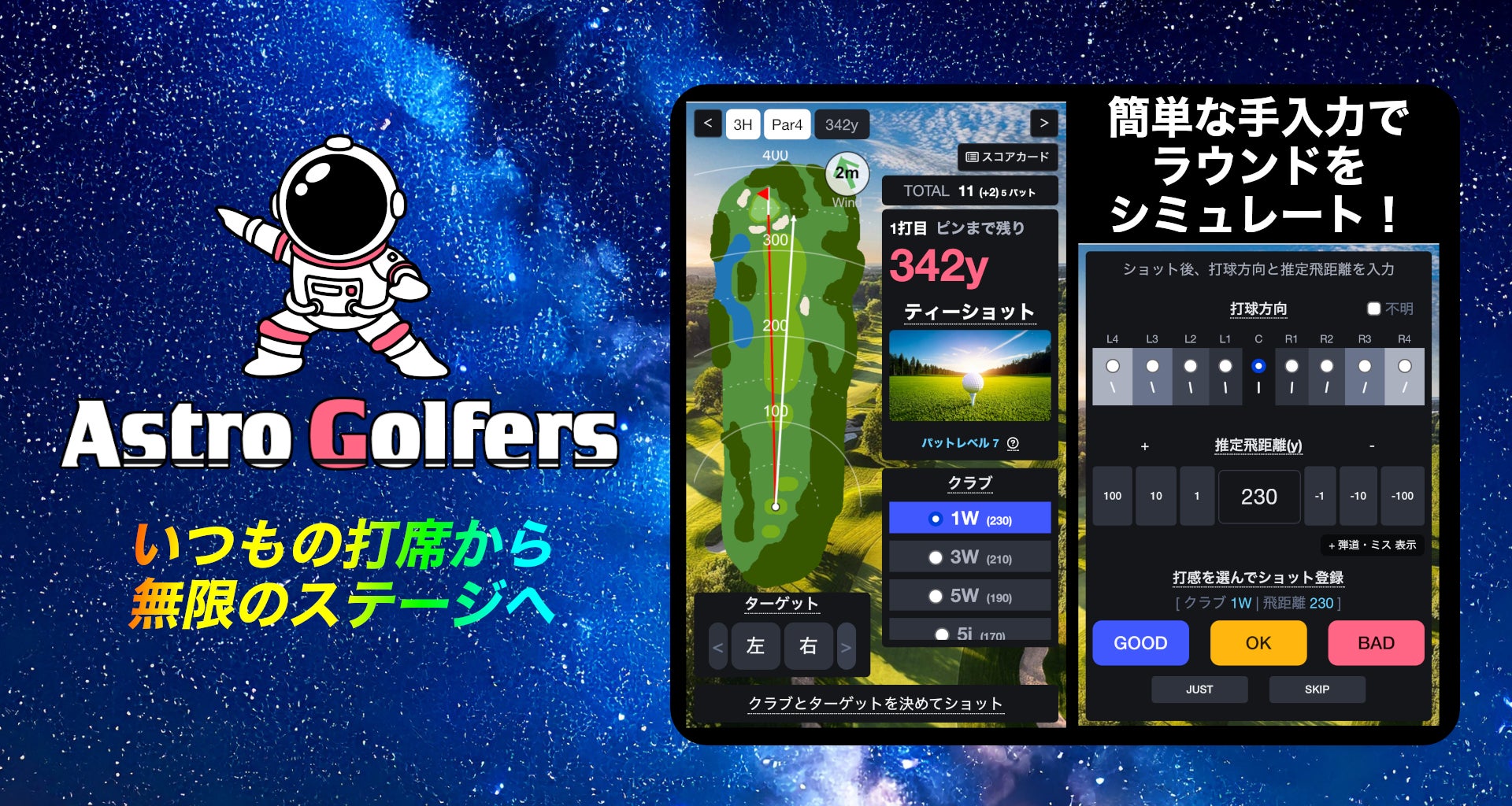 『Astro Golfers』は、ゴルフ練習場や自宅など、測定器を使わず簡単な入力で本格的なラウンド体験を楽しめる、まったく新しいタイプのアプリです。