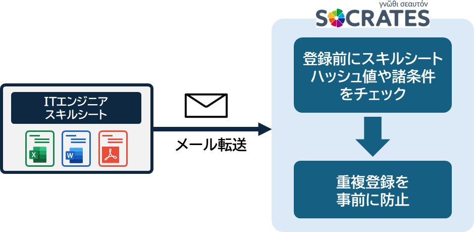 メール添付されたスキルシートのハッシュ値を登録することによる同一ファイルの重複登録の防止(*エンジニア単価や稼働可能開始日などメール文面に諸条件の変更があった場合は、諸条件箇所のみ自動更新可能)
