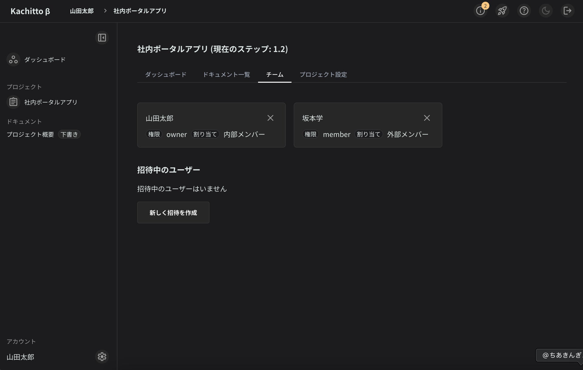 プロジェクト毎にチームメンバーを招待することができるため、発注側、受注側が双方で共通のドキュメントを管理することが可能です。チームメンバーは内部のメンバー、外部のメンバーと割当ができるようになっており、ドキュメントを作成する担当も明確になっています。