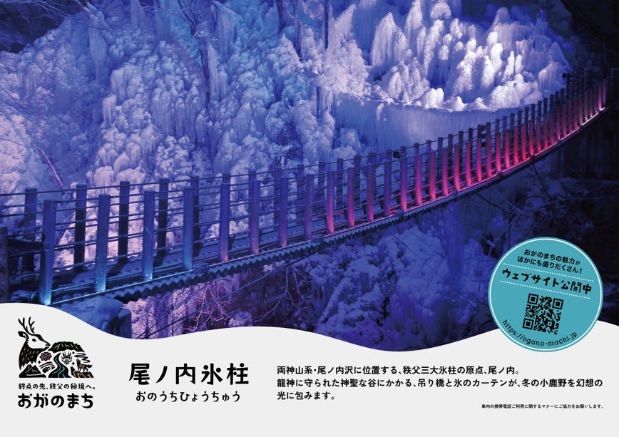 秩父地域全体の観光誘致を推進し、アクティブな旅を「ラビューで秩父っとび!」というシリーズで発信している西武鉄道のサポートのもと、11月4日(火)から11月9日(日)までの期間中、西武鉄道池袋線の1編成(10両)を使用し、小鹿野町と西武鉄道のビジュアルで車内を彩る車両ジャックを展開します。車内のデザインには、小鹿野町の風土を感じていただけるように、夕日に映える両神山や、幻想的な氷のカーテンが広がる尾ノ内氷柱などの絶景をはじめ、小鹿野春祭りで上演される「屋台歌舞伎」など独自の伝統文化などを紹介する車内広告を掲出します。また、車内ビジョンでは小鹿野町の魅力をより具体的に伝える映像を放映し、訪れるきっかけとなるような地域の風景や人々の姿を紹介していきます。