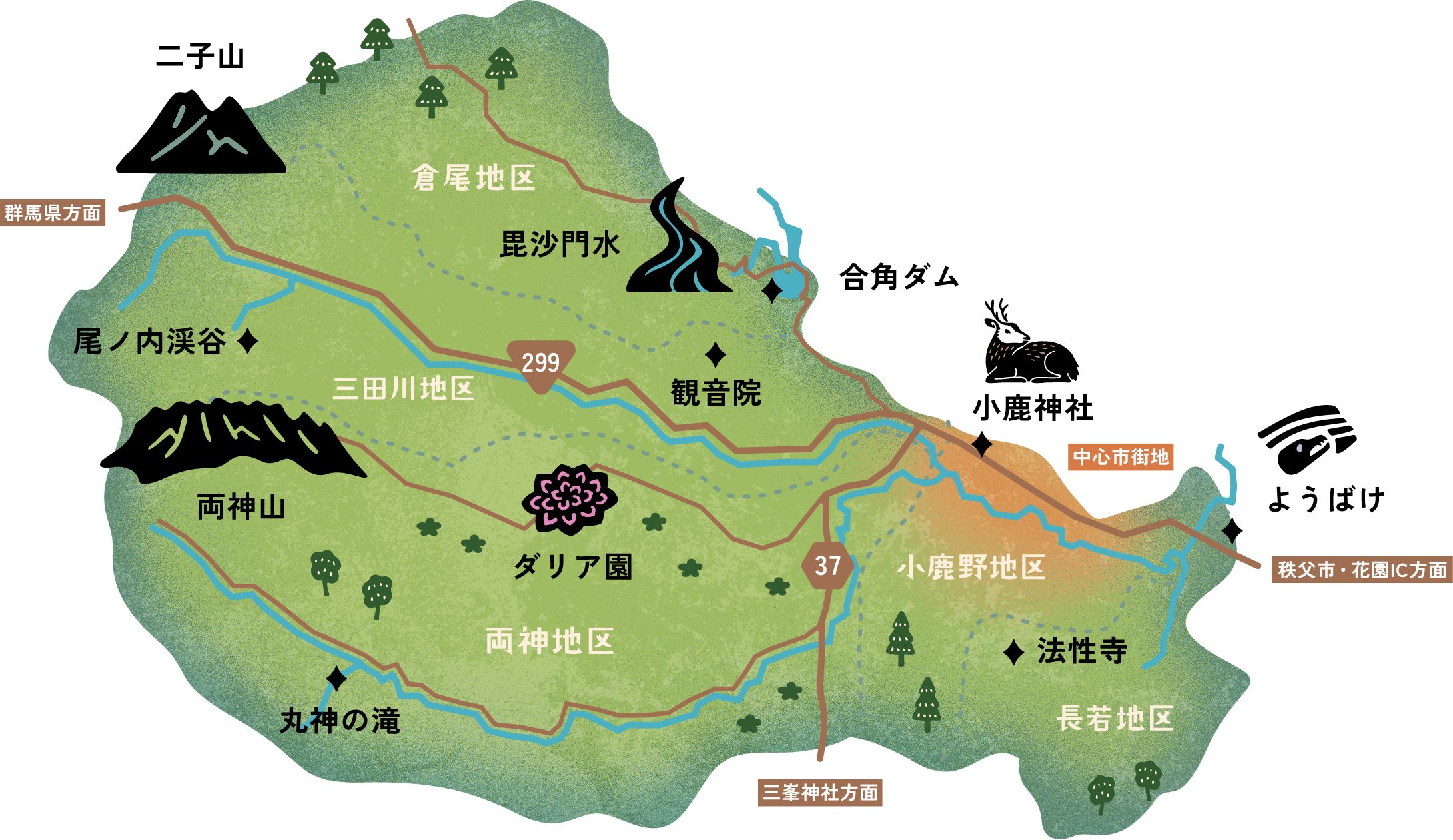 小鹿野町は、埼玉県の北西部に位置し、秩父郡1市4町の1つです。秩父郡内で唯一鉄道は通っていませんが、日本百名山「両神山」を始め、日本の滝百選「丸神の滝」、平成の名水百選「毘沙門水」など数々の百選を持ち、美しい自然と山里の景観を備えています。小鹿野の地名の起こりは平安時代に遡り、江戸時代には東京・山梨・長野を結ぶ街道の要所となり、他地域との盛んな交流によって多種多様な祭り・農村歌舞伎や神楽など独自の歴史と文化が育まれました。かつての宿場町としての面影を現在も継承し、「おもてなし」の心と人情あふれる人々が魅力です。