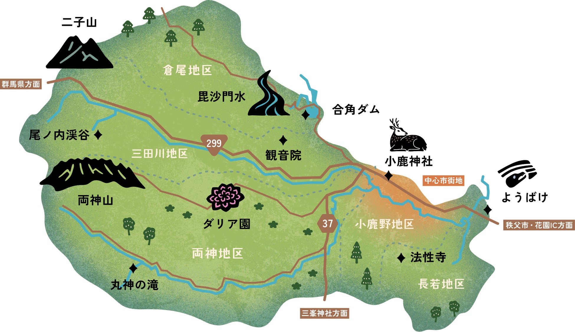 都心からおよそ2時間。便利さと自然の豊かさが共存する秩父地域のさらに奥、三方を秩父市に囲まれた静かな谷あいに、小鹿野町はあります。