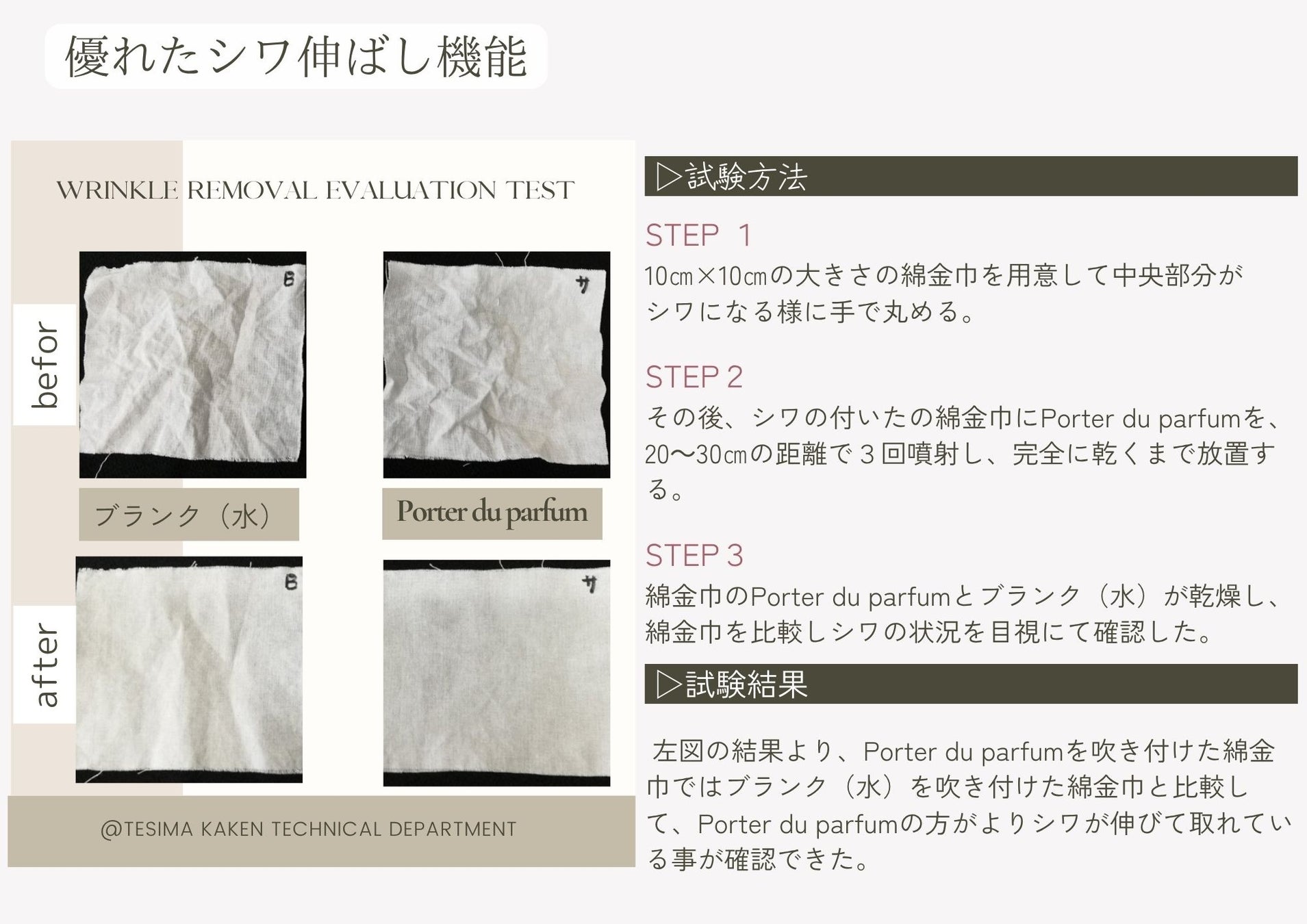 下の試験結果でも確認できるように、ある程度のシワは水でも伸ばすことができますが、
