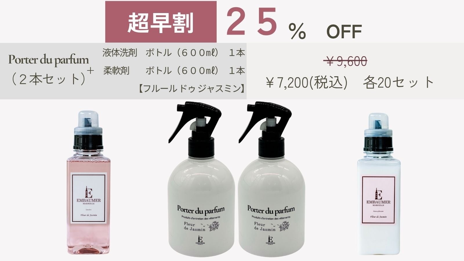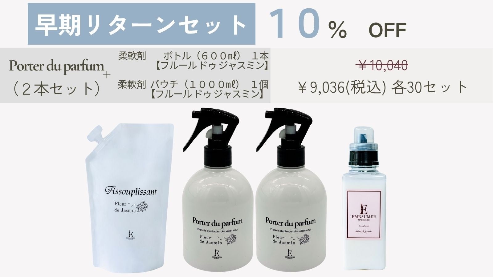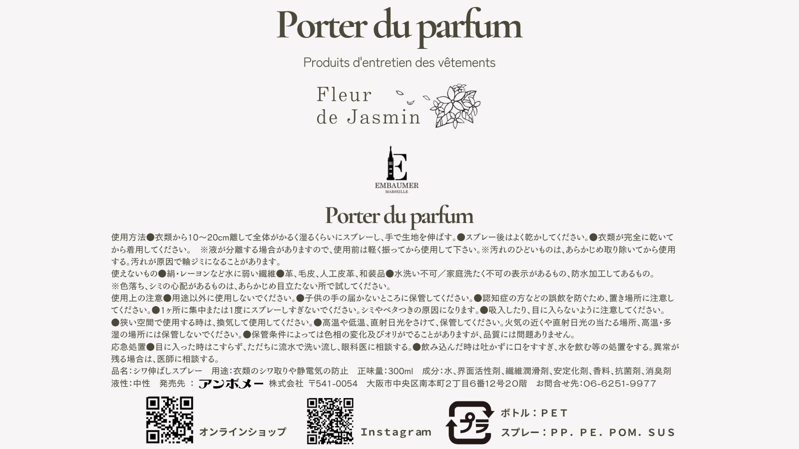 EMBAUMER公式オンラインショップでは、Porter du parfumと同じ香りの液体洗剤・柔軟剤【Fleur de Jasmin(フルール ドゥ ジャスミン)】を販売しております。柔軟剤との香りを統一してご使用いただくことで、香りをキープ。お気に入りのお洋服を洗濯時、取り込む時、着用時、着用前…良い香りで満たされます。