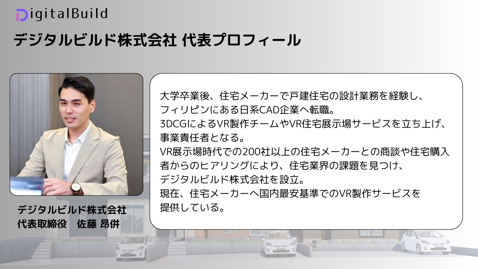 デジタルビルド株式会社の代表・佐藤昂併は、大学卒業後に大手住宅メーカーで戸建住宅の設計を経験し、その後、VR展示場の責任者として、200社以上の住宅メーカーと商談を重ねてきました。
