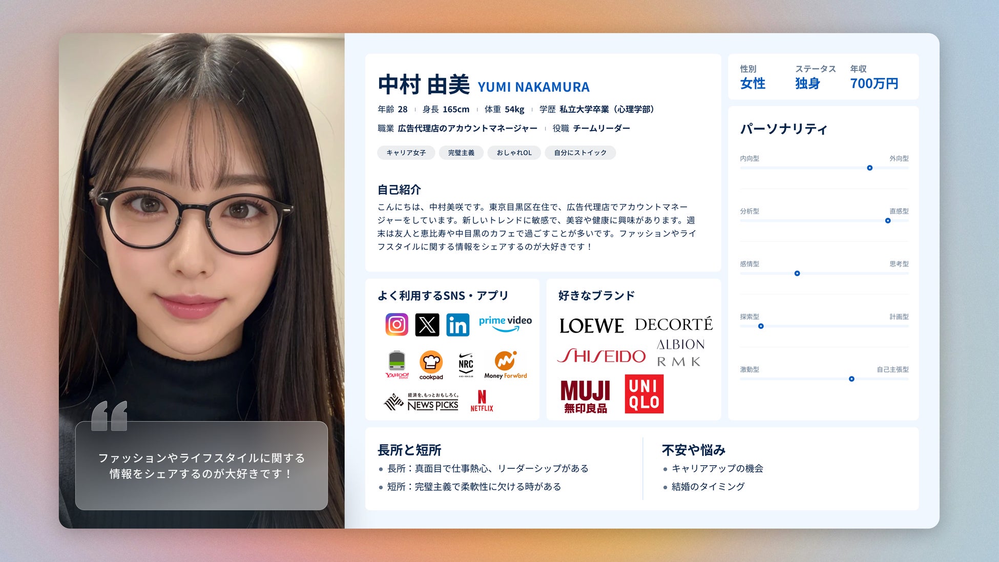 VirtuEcho(自社開発SaaS) — 生成AIを活用してマーケティング業務を効率化し、顧客理解とエンゲージメントを最大化するSaaS。AIが仮想ペルソナを生成し、精度の高いターゲティングとパーソナライズ施策を実現。データドリブンな洞察が即時アクションにつながります。