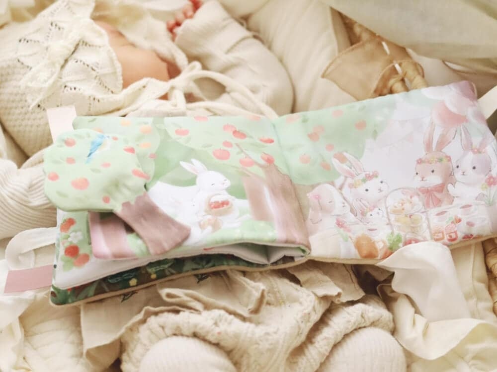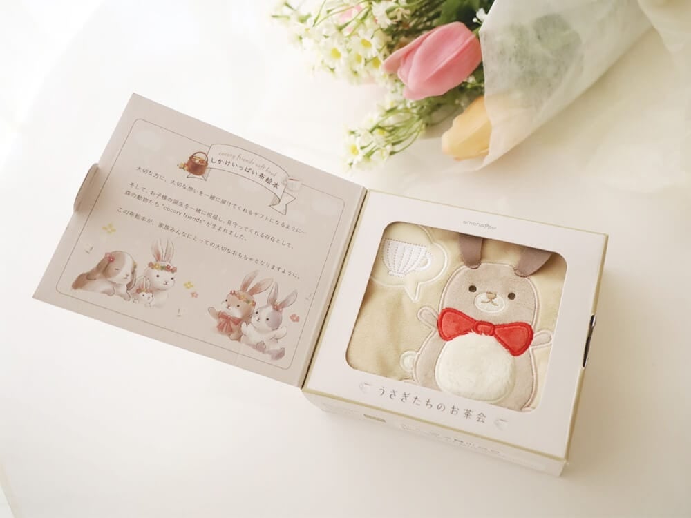 『ふんわりえほん うさぎたちのお茶会』は、やさしいくすみカラーとふんわりした質感が特徴の布絵本です。