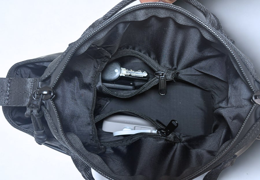 開けずに出し入れ1秒!便利な専用ポケット。中も濡れにくい撥水×435g軽量バッグ
