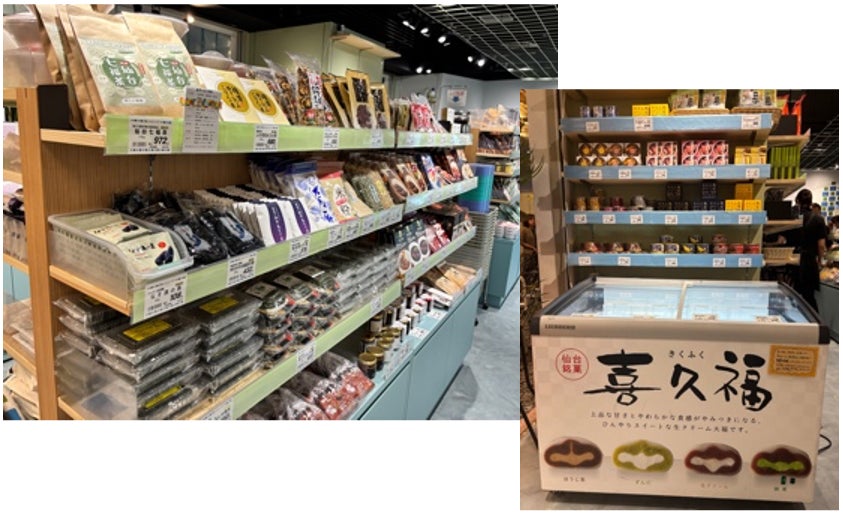 牛たん、ずんだ、笹かまをはじめ、水産・農産加工品、菓子、地酒、工芸品、雑貨まで、宮城県を代表する約800点の特産品を取り揃えています。仙台市の観光名所「定義如来 西方寺」の門前名物として親しまれる「三角油揚げ」や、ふわもち食感が人気のスイーツ「喜久福」など、宮城ならではの味も有楽町で購入可能に。今後はお客様のご要望にもお応えしていく予定ですので、「東京で買いたい宮城の特産品」をぜひお聞かせください。