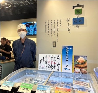 店頭に宮城県内の生産者が立ち、商品のこだわりや産地背景を直接お客様にお伝えする販売・試食コーナーも設置。会話を通じて背景を知り、試食で味わうことで、「つくる人」と「食べる人」がつながる場となっています。オープン時は石巻で創業し、現在は美里町で冷凍ハンバーグを中心とした冷凍食品の製造および販売を手掛ける「大地フーズ」のいわしハンバーグが出展。宮城の海の恵みをぎゅっと詰め込んだ味わいをお楽しみください。