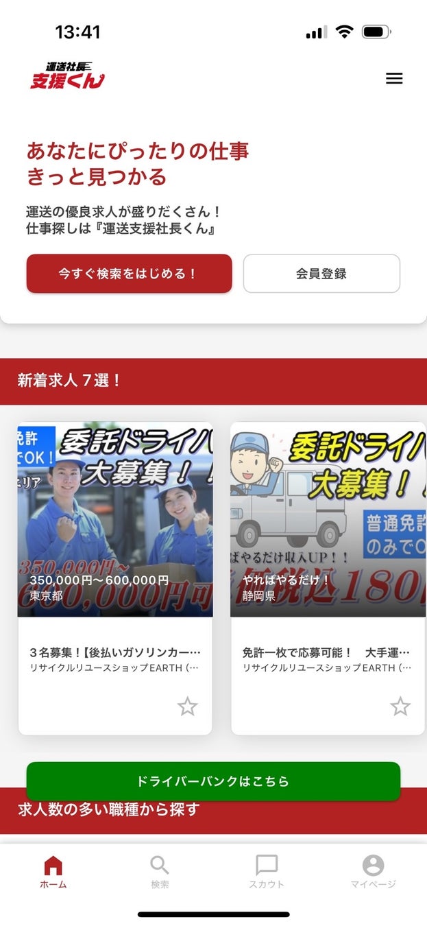 「運送社長支援くん」は、運転職に特化した求人アプリです。軽貨物、トラック、バス、タクシー、運転代行など、幅広い職種に対応し、求職者が勤務地や雇用形態、待遇など詳細条件を設定して検索・応募できる仕組みを整えています。企業側も手軽に求人情報を掲載・管理でき、応募者とのマッチング精度を高める設計を採用しています。