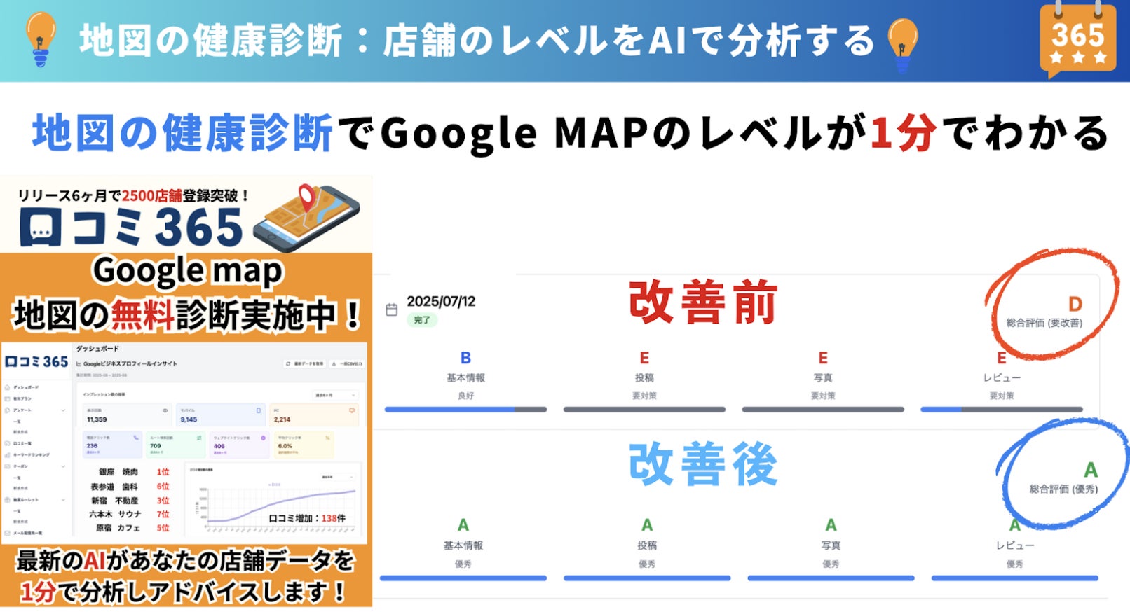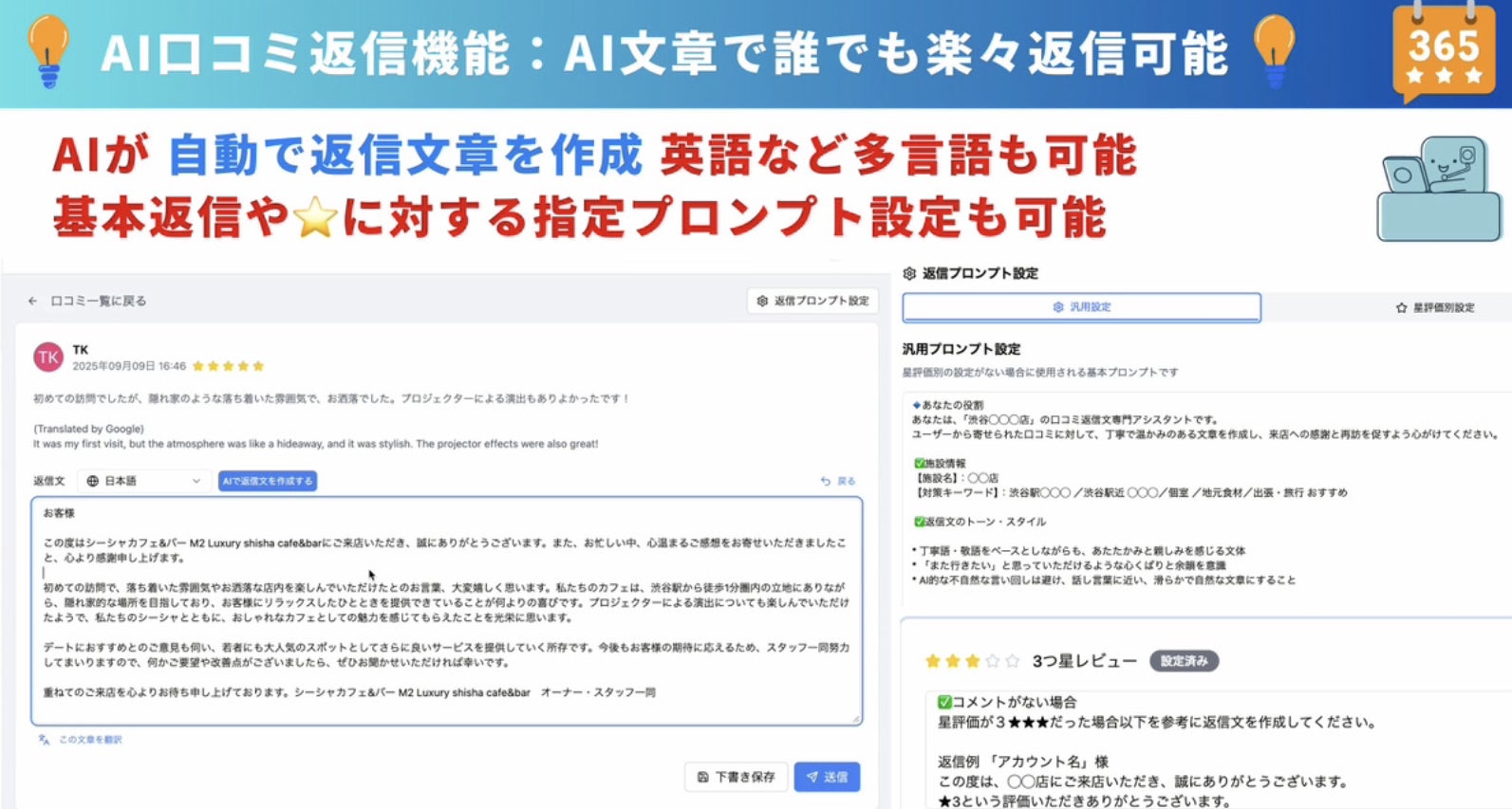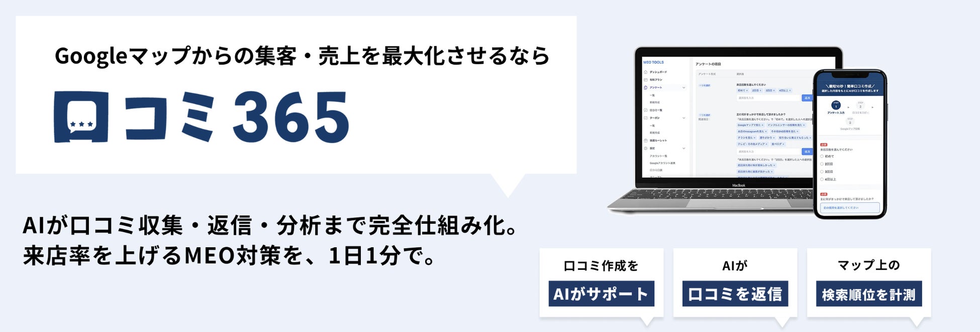 「口コミ365」は、GoogleビジネスプロフィールやInstagram、LINEなど複数の口コミチャネルを一元管理できるクラウド型ツールです。主な機能は以下の通りです:口コミ自動収集・分析:Google/LINEレビュー/インスタ投稿などを自動取得AIサマリー機能:レビュー内容を自動要約し、改善点を提示返信テンプレート管理:ブランドトーンを保ちながら迅速対応レポート出力:期間別評価推移や店舗比較を自動生成これにより、現場スタッフの手間を減らしつつ、口コミを店舗経営の武器として活用できます。口コミ365導入店舗の平均成果(2025年9月時点):検索表示回数:平均+250%増ルート検索回数:平均+190%増主要キーワード10位以内表示率:73%導入1か月で「渋谷 ヘッドスパ」「山梨 グランピング」「八丁堀 焼肉」などの主要KWで上位表示を達成するなど、成果が続出しています。