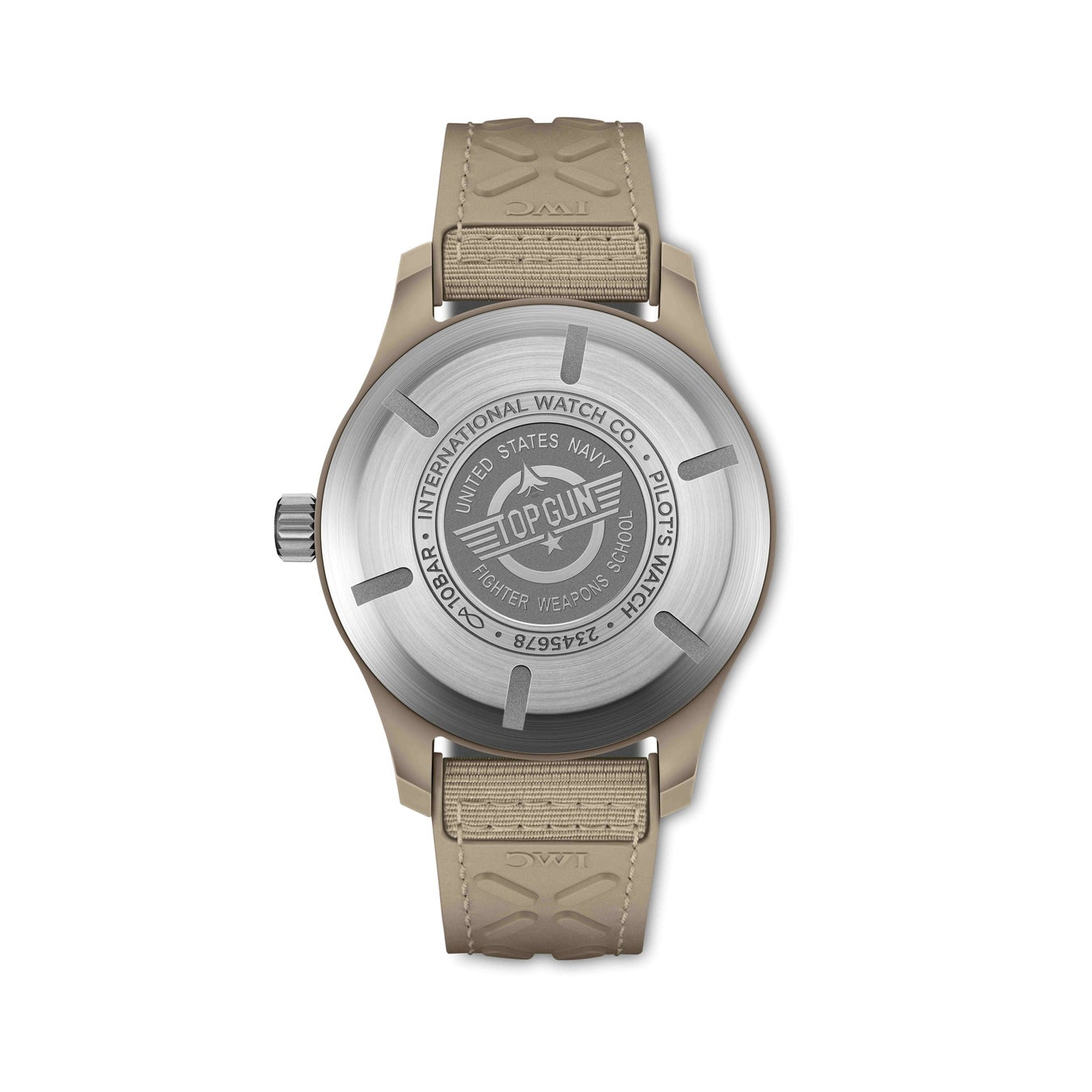 パイロット・ウォッチ・オートマティック 41・トップガン・モハーヴェ・デザートは、そのトーン・オン・トーンのデザインが特徴です。セラミックケースに合わせ、ブラウンのダイアルには落ち着いたトーンの目盛りと数字を配置し、またスーパールミノバョでコーティングされているため、わずかな明かりでも正確に数字を読み取ることができます。単色のデザインは、布製インレイ付きのベージュラバーストラップとチタン製ピンバックルによって引き立てられています。軽量で丈夫なチタンもケースバックに使用され、アイコニックな“TOP GUN”ロゴが刻まれています。