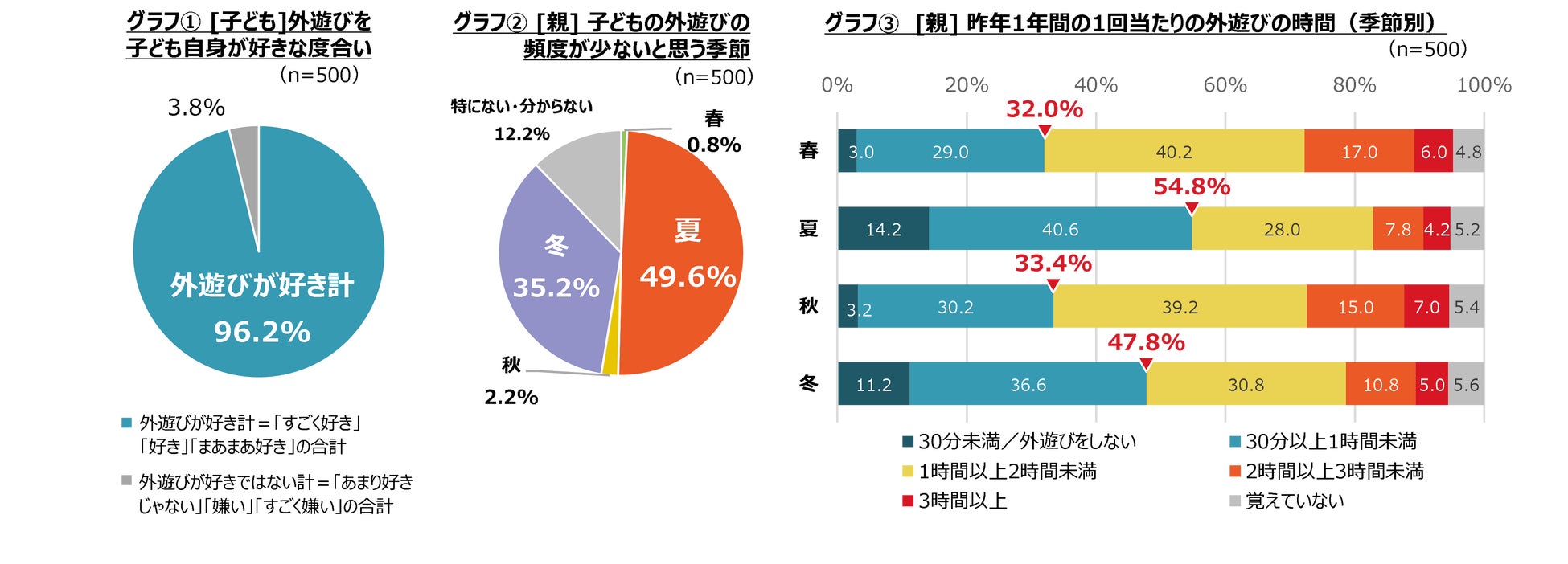 子どものほぼ全員が「外遊びが好き」なのに、夏は子どもの外遊びの頻度が最も少ない季節と答えた親が、冬の約1.5倍にも。夏の遊び時間についても、1日1時間未満という回答が5割以上(54.8%)。