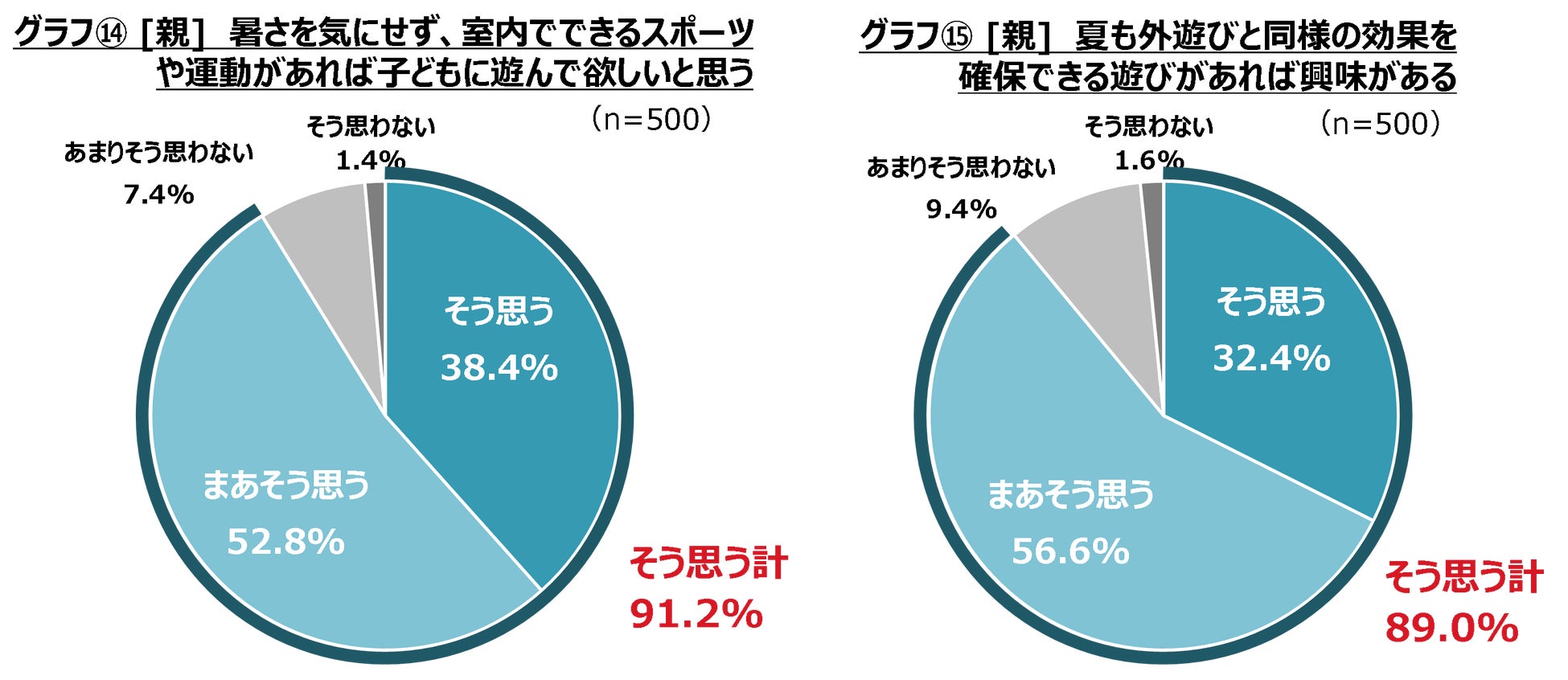 このような子どもが室内でできるスポーツや運動へ親がどの程度関心があるかを聞いてみると、暑さを気にせず、室内でできるスポーツや運動があれば子どもに遊んで欲しいと思う」(91.2%) [グラフ⑭]、「夏も外遊びと同様の効果を確保できる遊びがあれば興味がある」89.0%という結果となりました。[グラフ⑮]