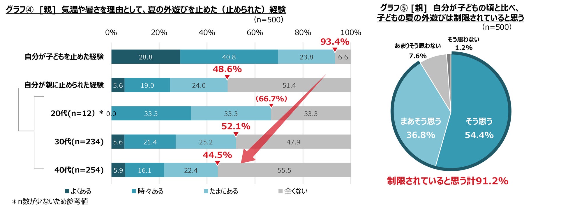 ●夏、外遊びの頻度や時間が少ないのは暑さが原因。昨夏子どもの外遊びを止めたことのある親は93.4%と、親の子ども時代(全くない:51.3%)と対照的。