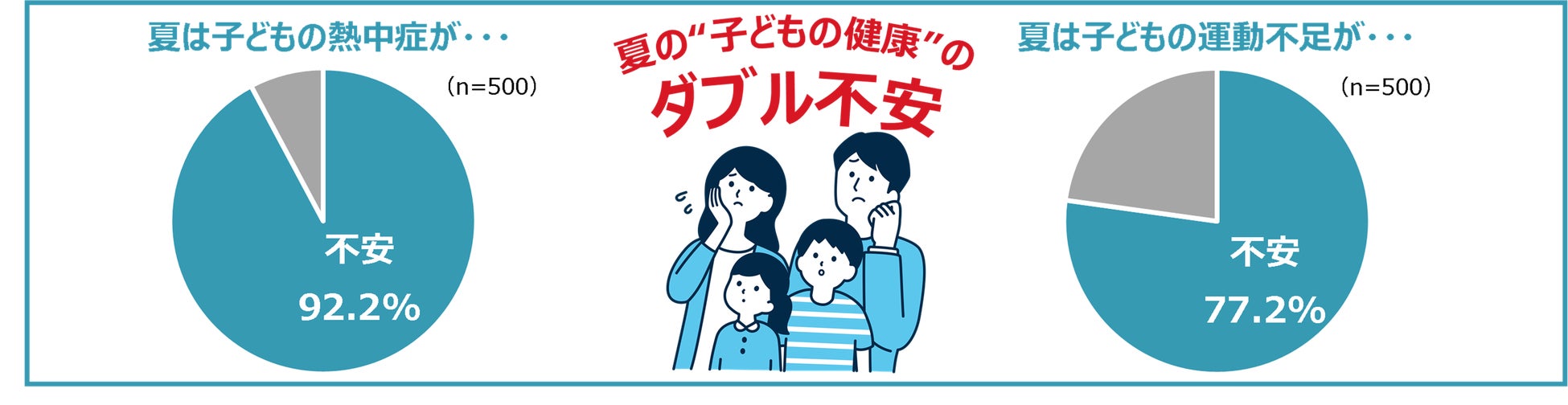 暑さ指数(WBGT)28℃以上の場合、子どもは屋外での運動を控えることが推奨されています※2。しかし東京の6~8月のWBGT28℃以上の日を、2010~2014年と2020~2024の5年間を比較すると1.4倍に増加しており※3 、夏は子どもの遊ばせ方が悩ましい季節となっています。そのため、親は夏の子どもの健康に、「熱中症への不安」(92.2%)と「運動不足への不安」(77.2%)の“ダブル不安”を抱えていることが明らかになりました。