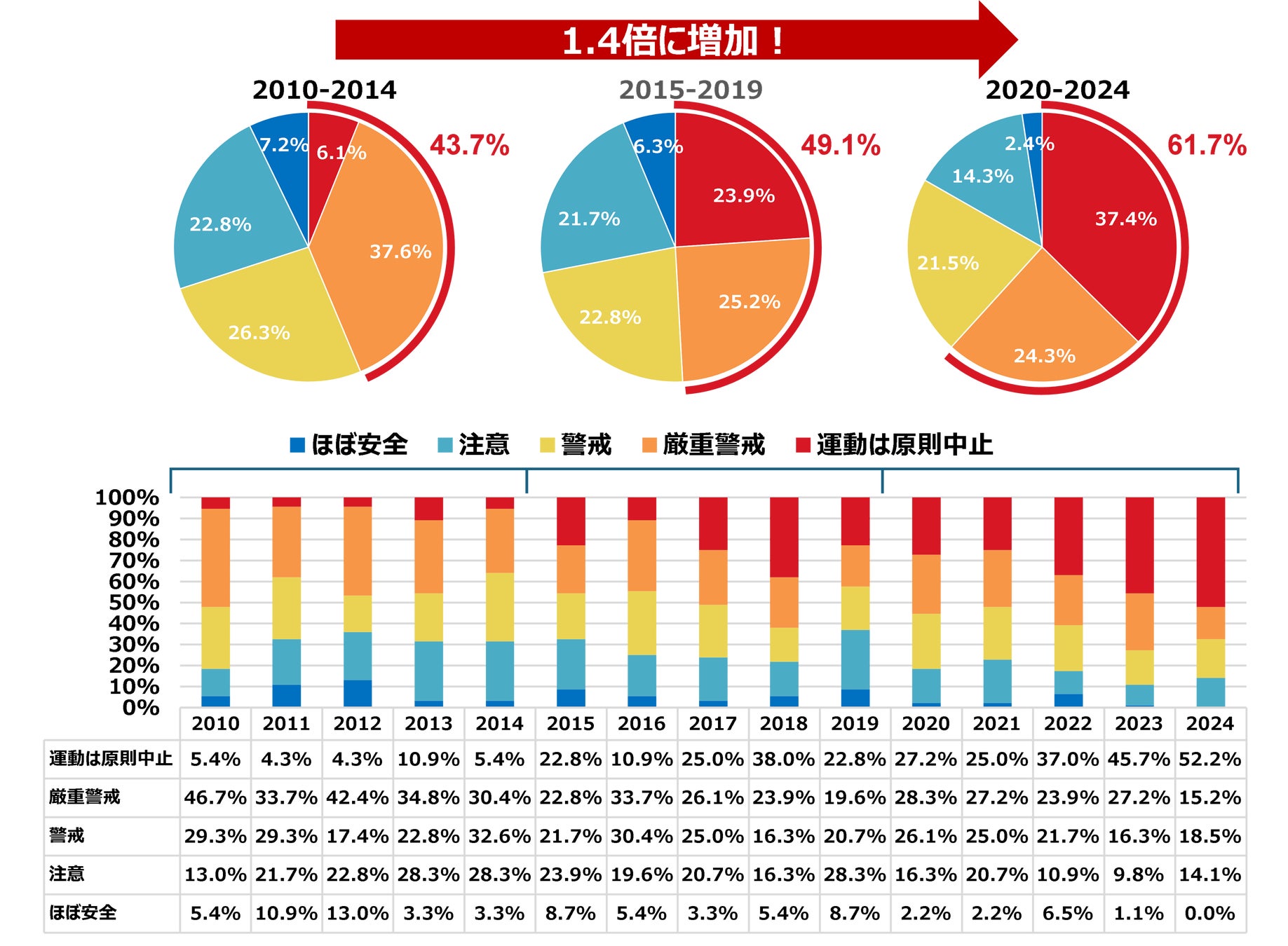 92日間中でWBGT28℃以上となる日は、2010〜2014年の5年間では年間平均で40.2日(43.7%)でしたが、2020年~2024年では56.8日(61.7%)と1.4倍に増加しています。特に、WBGT31℃以上の日数は、5.6日から34.4日と6倍以上に増加し、かつてはほとんど見られなかった危険な暑さが、近年では1週間のうち約3日出現するようになっています。