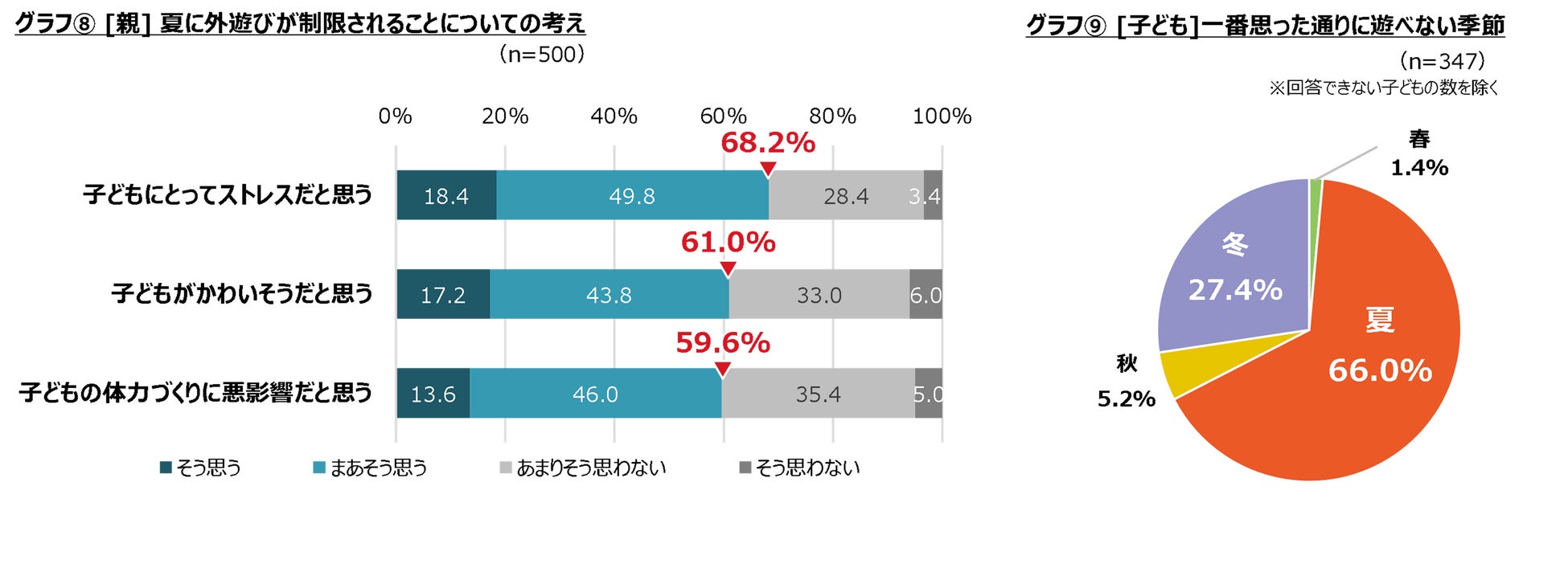 このような外遊びの制限が子どもにとって「ストレス」(68.2%)と懸念。実際、子ども3人に2人(66.0%)が「夏」は「一番思った通りに遊べない季節」と不満。